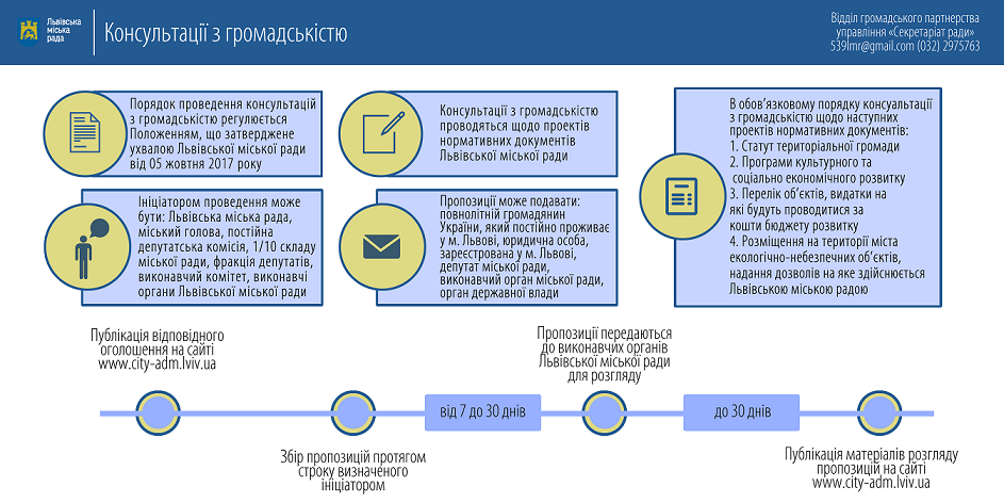Консультації з громадськістю проводяться у формі подання пропозицій (поштою, через Центр надання адміністративних послуг м. Львова або електронними засобами зв’язку). Пропозиції може подавати: повнолітній громадянин України, який постійно проживає у м. Львові, юридичні особи, які зареєстровані у встановленому порядку та діють на території м. Львова, депутати Львівської міської ради, виконавчі органи Львівської міської ради, органи державної влади.