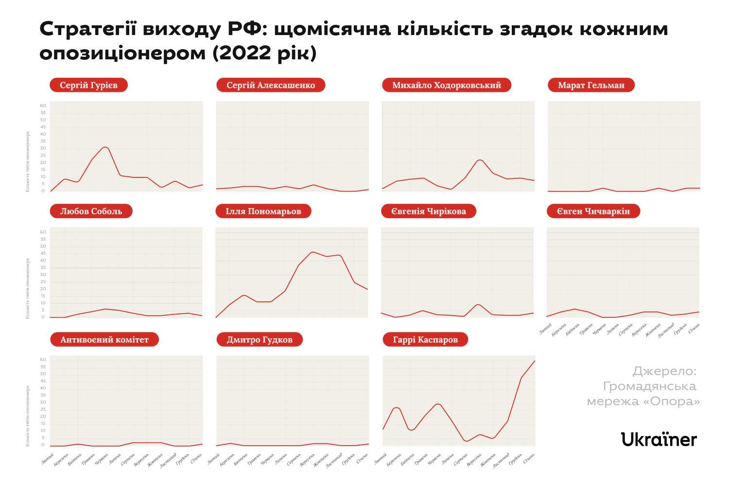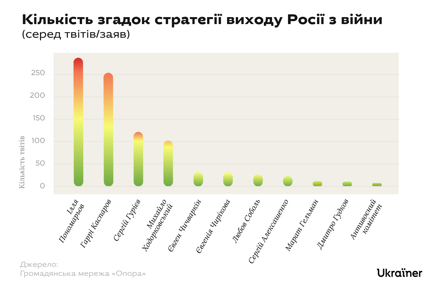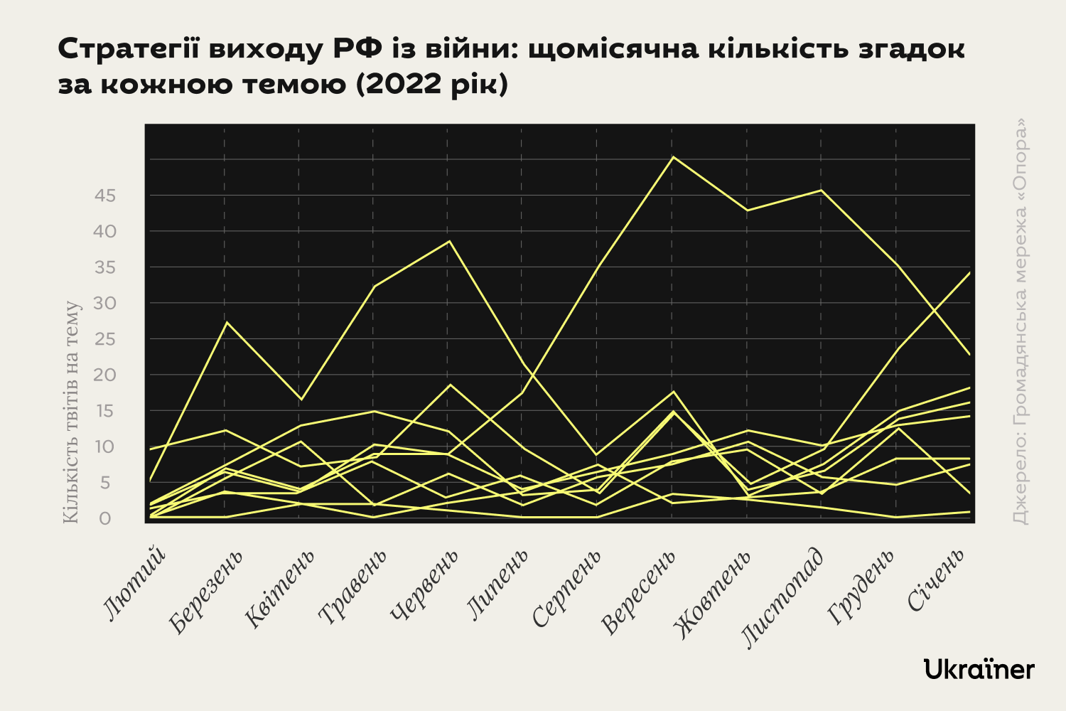 Загалом представники Антивоєнного комітету та Форуму вільної Росії протягом майже року повномасштабної війни опублікували 875 згадок різних аспектів стратегії виходу Росії з війни.