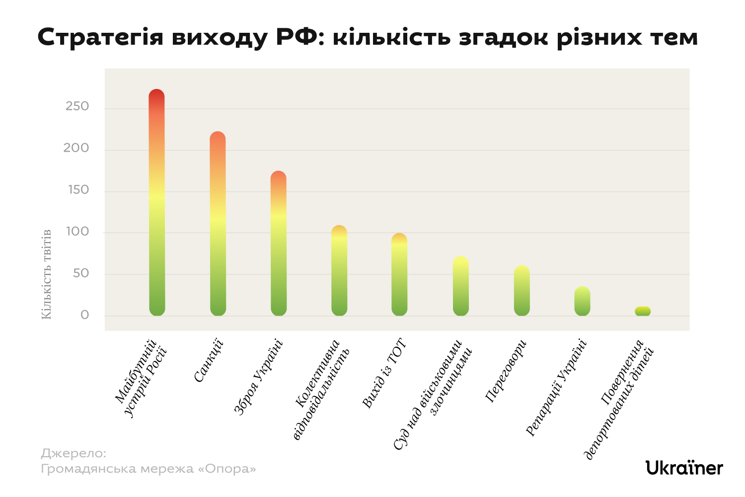 Усі 9 тем, окреслені як маркери стратегії виходу Росії з війни в Україні, були у твітах і публікаціях російських опозиціонерів.