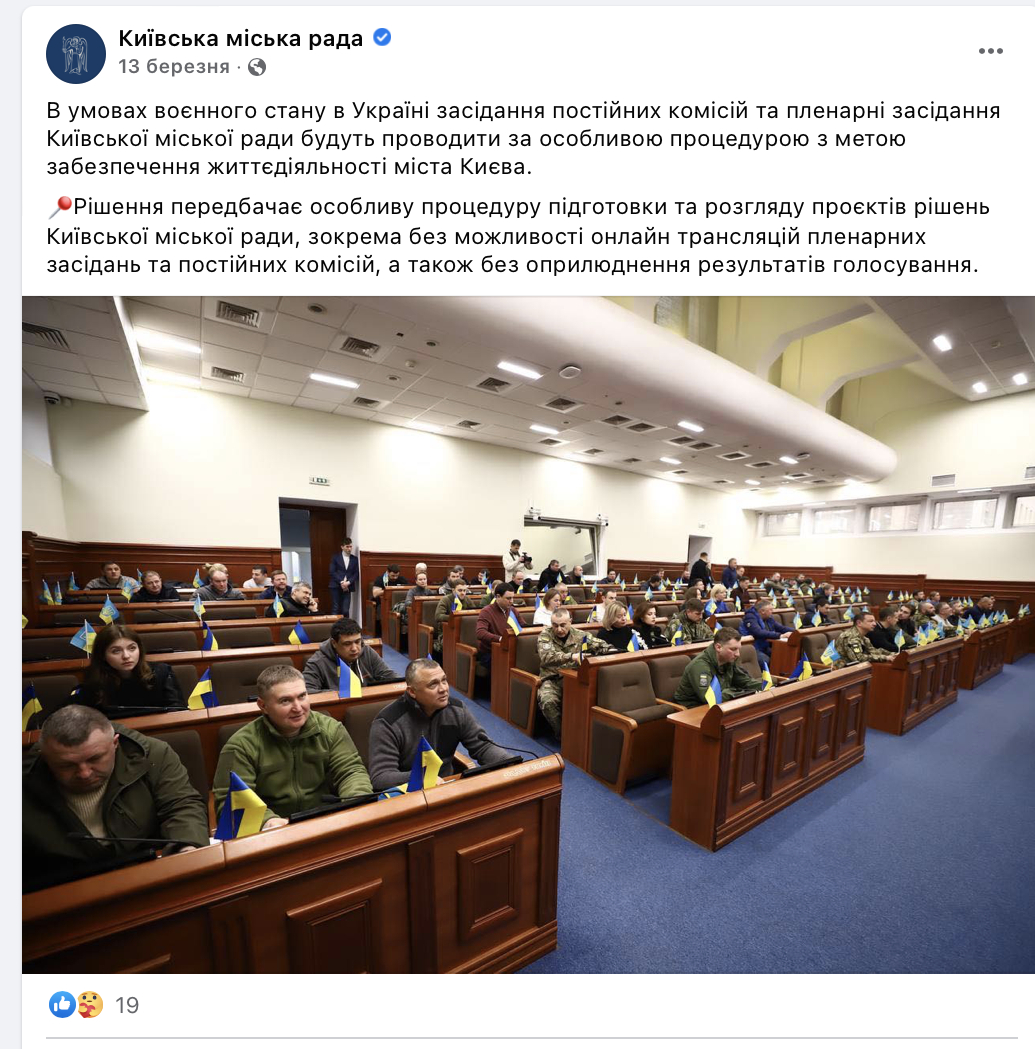 Робота Київської міської ради, а саме пленарні засідання відбувалися в офлайн-форматі за адресою вул. Хрещатик 36, безпосередньо в будівлі КМР. Однак на офіційній Facebook-сторінці Київради в одному з дописів йшлося: "В умовах воєнного стану в Україні засідання постійних комісій та пленарні засідання Київської міської ради будуть проводити за особливою процедурою… Рішення передбачає особливу процедуру підготовки та розгляду проєктів рішень Київської міської ради, зокрема без можливості онлайн-трансляцій пленарних засідань та постійних комісій, а також без оприлюднення результатів голосування". Втім, уже з червня 2022 року на офіційній сторінці Київради на платформі YouTube відновили трансляцію пленарних засідань, але поки що не відомо, чи відбуватимуться трансляції далі, адже воєнний стан продовжено до серпня.