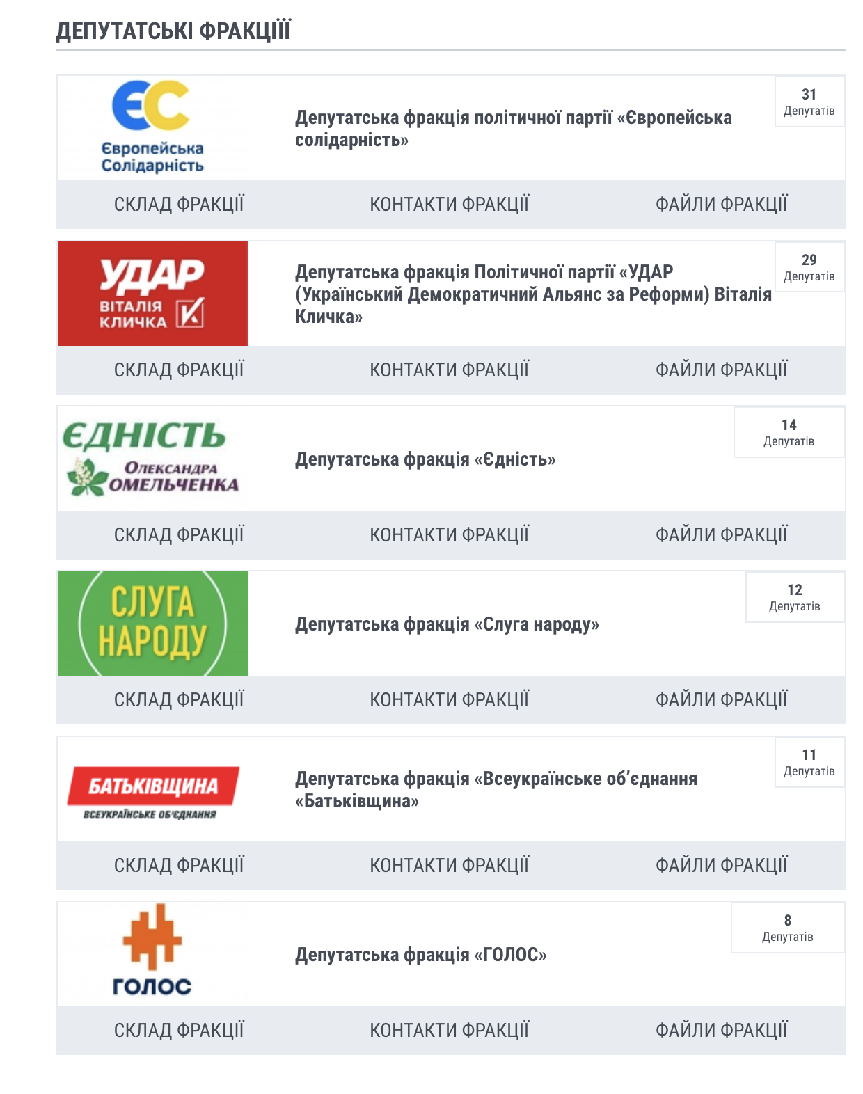 Станом на червень 2022 року в міськраді Києва функціонують такі депутатські фракції: "Слуга народу", ВО "Батьківщина", "Єдність Олександра Омельченка", "Європейська солідарність", "Опозиційна платформа — За життя", "УДАР" та "Голос". Також функціонує депутатська група "Платформа за життя та мир", склад якої можна побачити нижче.
