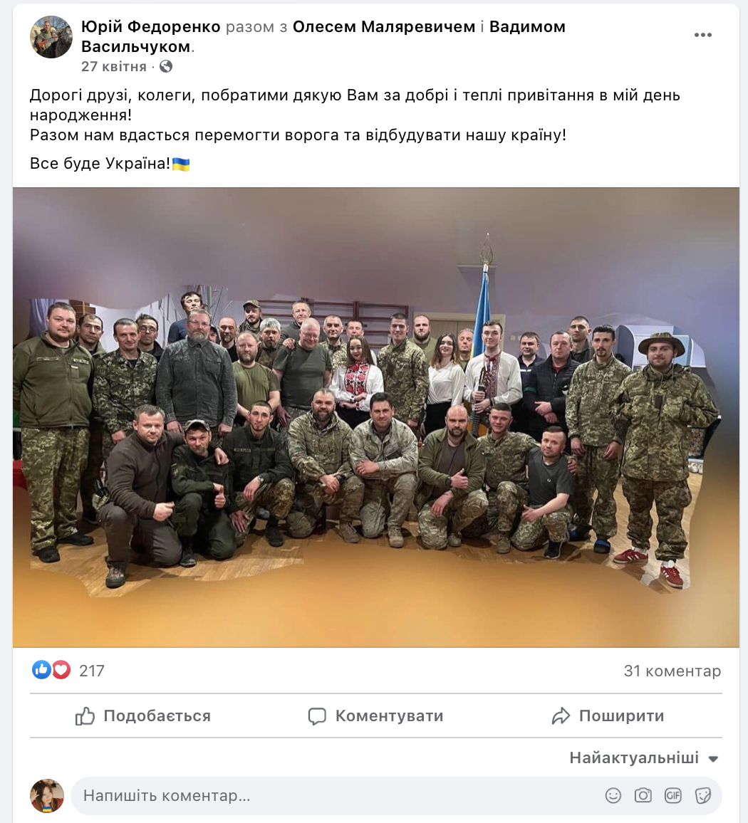 Депутати Київради теж не стоять осторонь війни. Частина з них ще 21 лютого увійшли до лав територіальної оброни (ТрО) Києва, а ще частина вирушили на схід. Колишній спецпризначенець, а тепер секретар постійної комісії Київради з питань архітектури, містобудування та земельних відносин Юрій Федоренко (фракція “Слуга народу”) дає відсіч агресору на околицях Харкова. Разом із ним служить Олесь Маляревич — перший заступник голови Дніпровської райдержадміністрації столиці, секретар постійної комісії Київради з питань транспорту, зв`язку та реклами (фракція “УДАР”). В тому самому підрозділі ТрО командиром взводу служить голова постійної комісії Київради з питань освіти і науки, сім'ї, молоді та спорту Вадим Васильчук (фракція “Голос”).