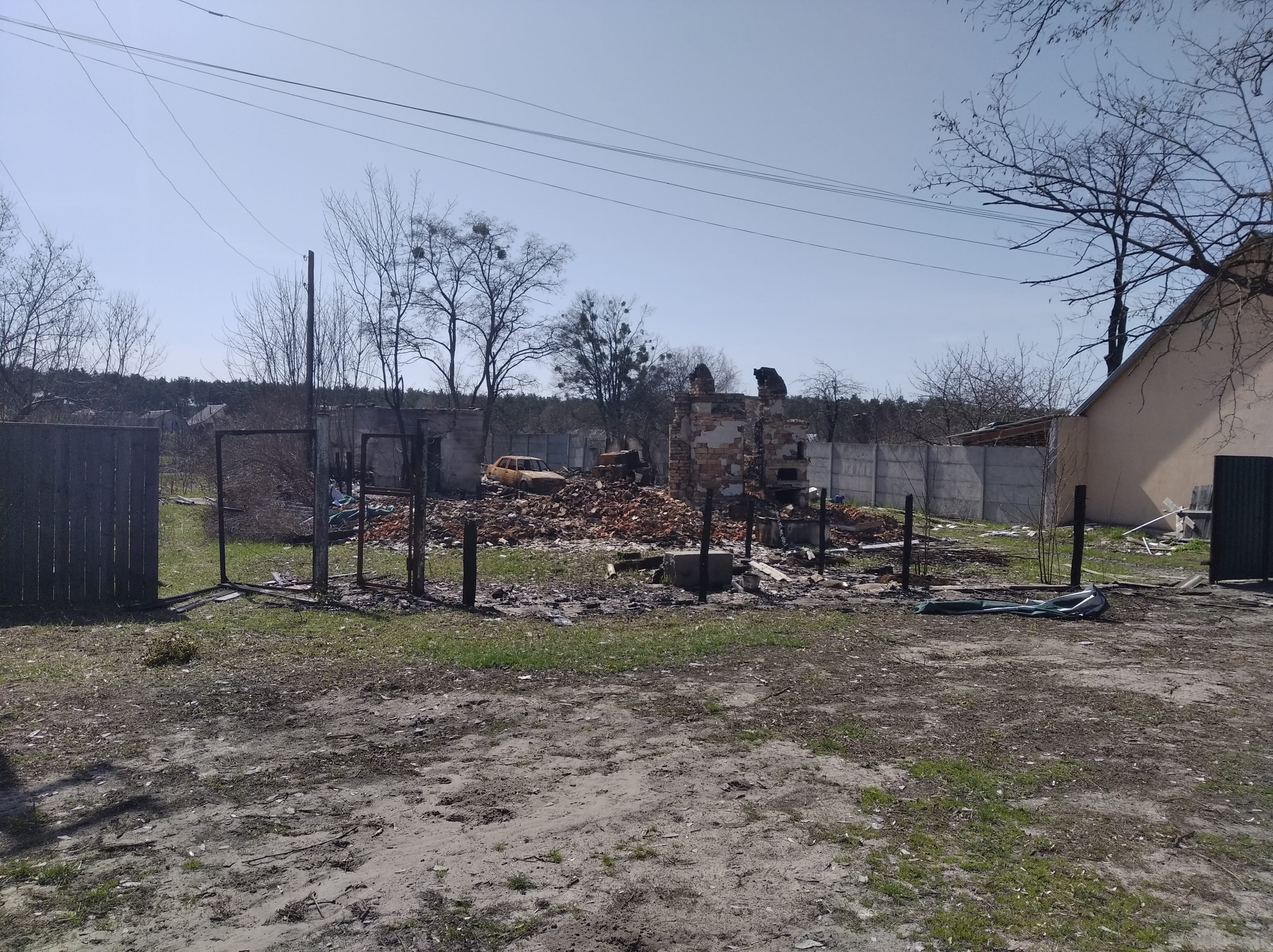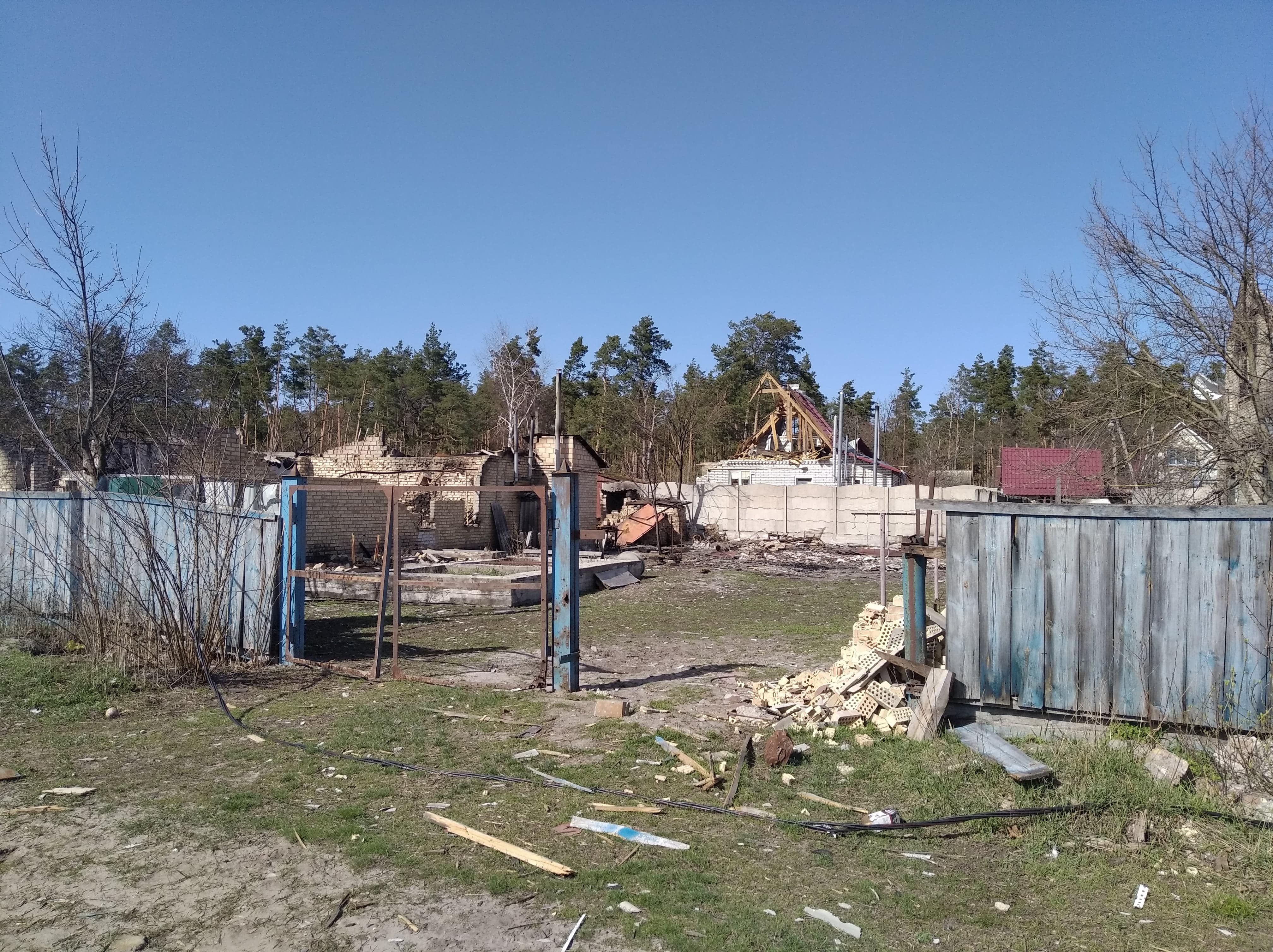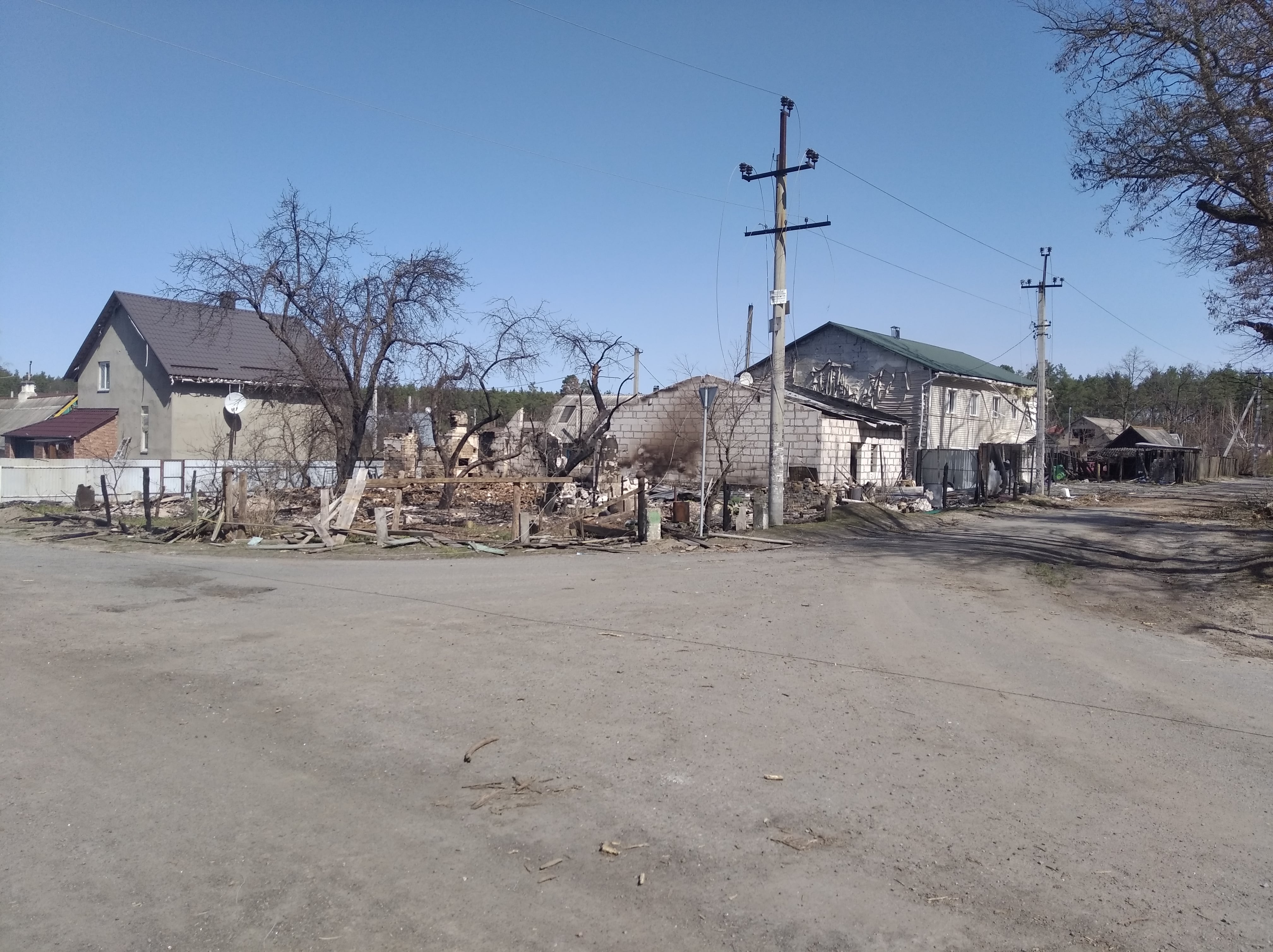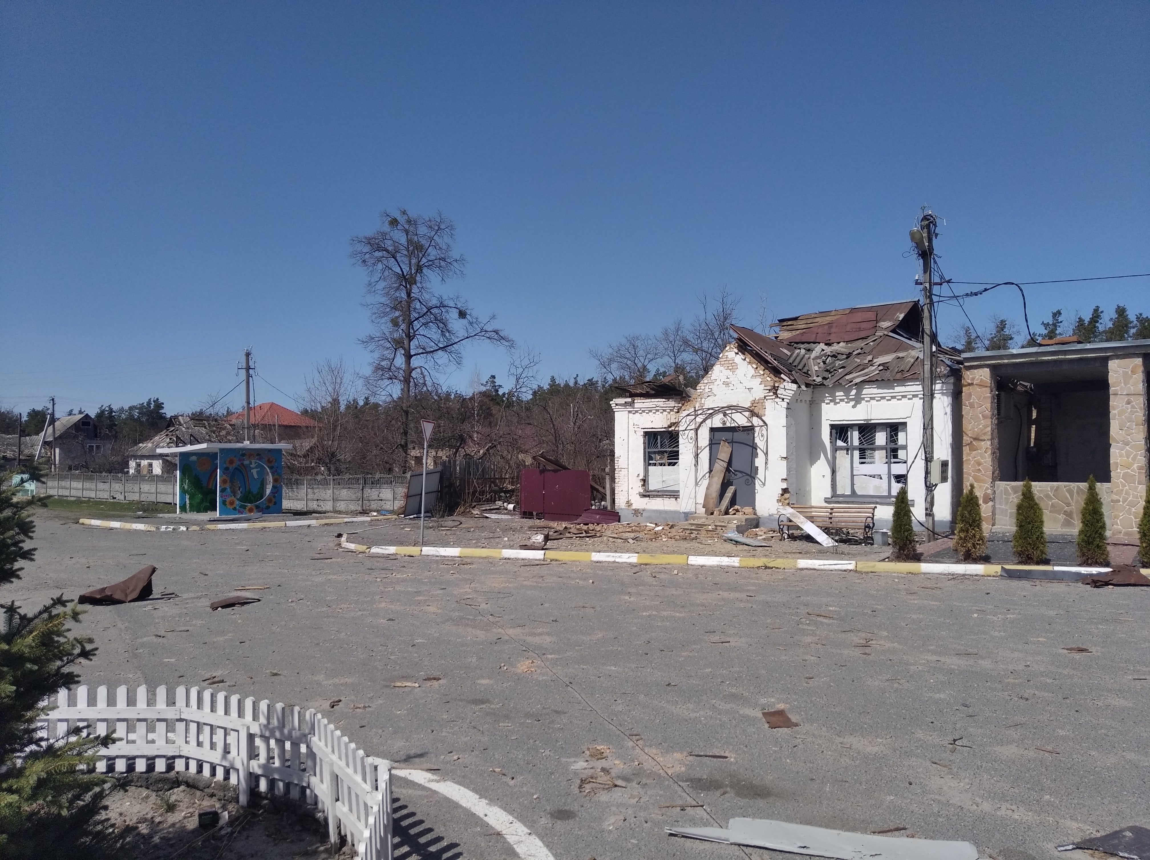 Знищені будинки, розбиті автівки, понівечені дороги, зруйновані могили на цвинтарі, повалені дерева, розкидані рештки снарядів, трупи загарбників та закатованих і вбитих осколками мешканців — так виглядало село наприкінці березня, коли росія почала відводити війська з Київщини.