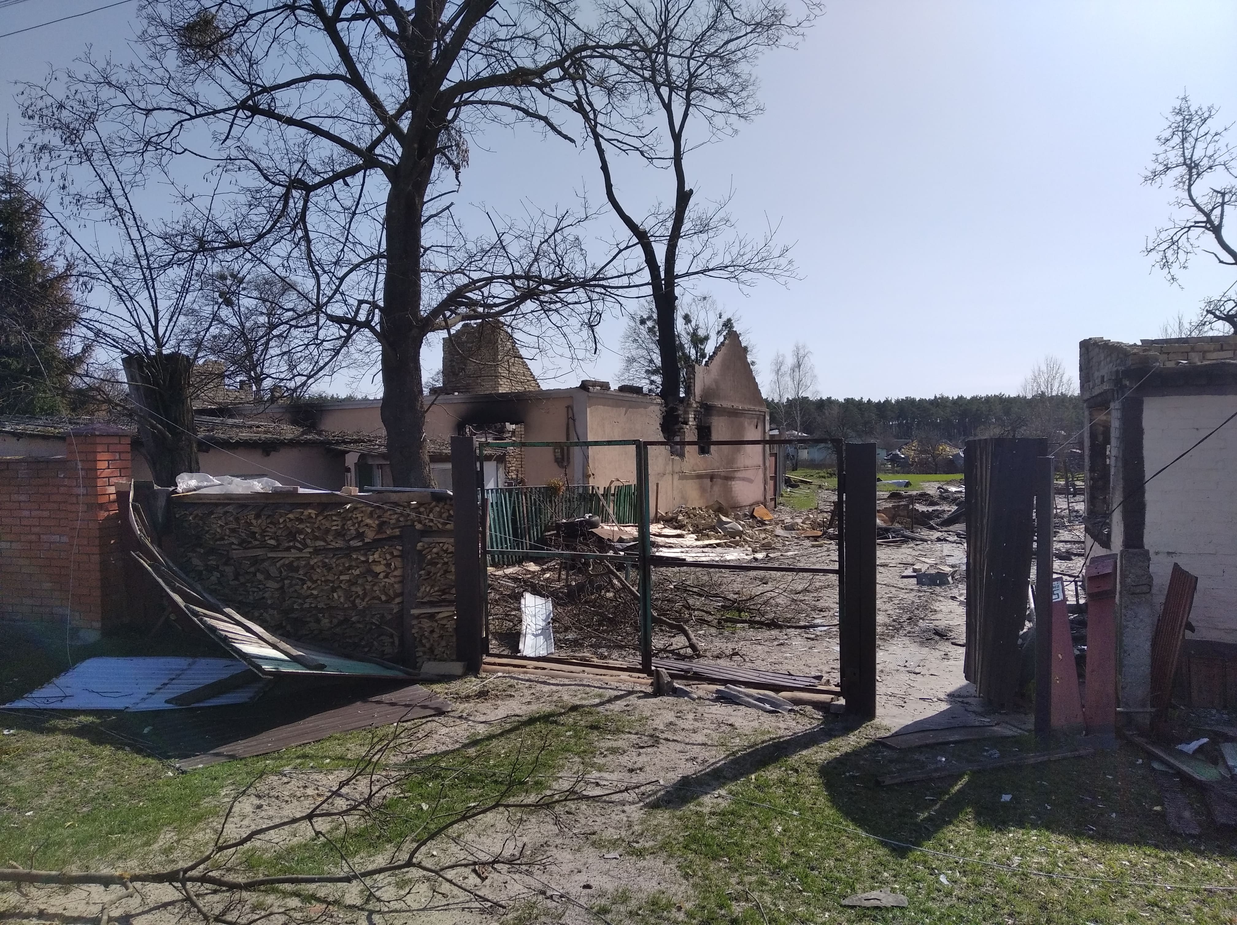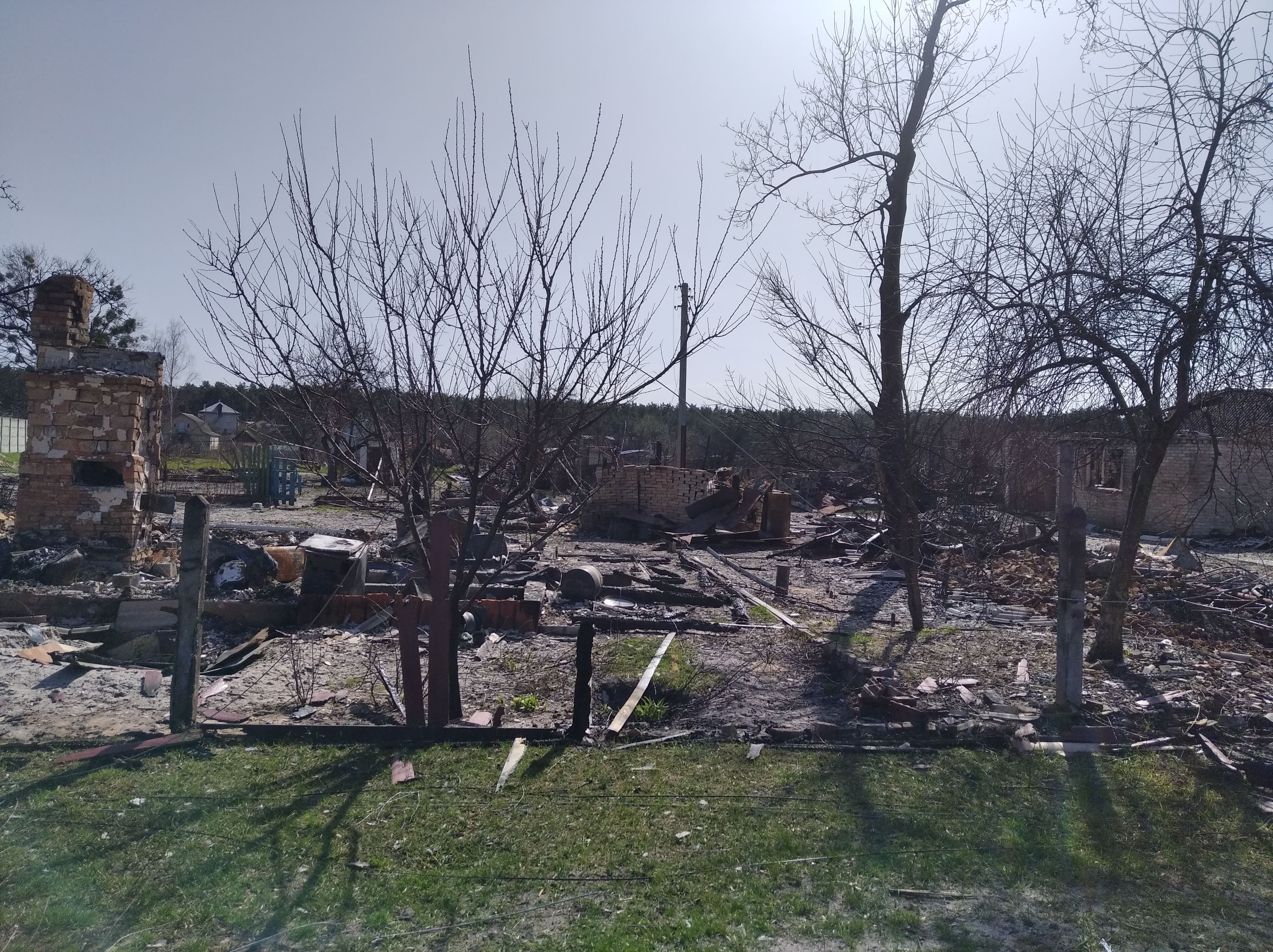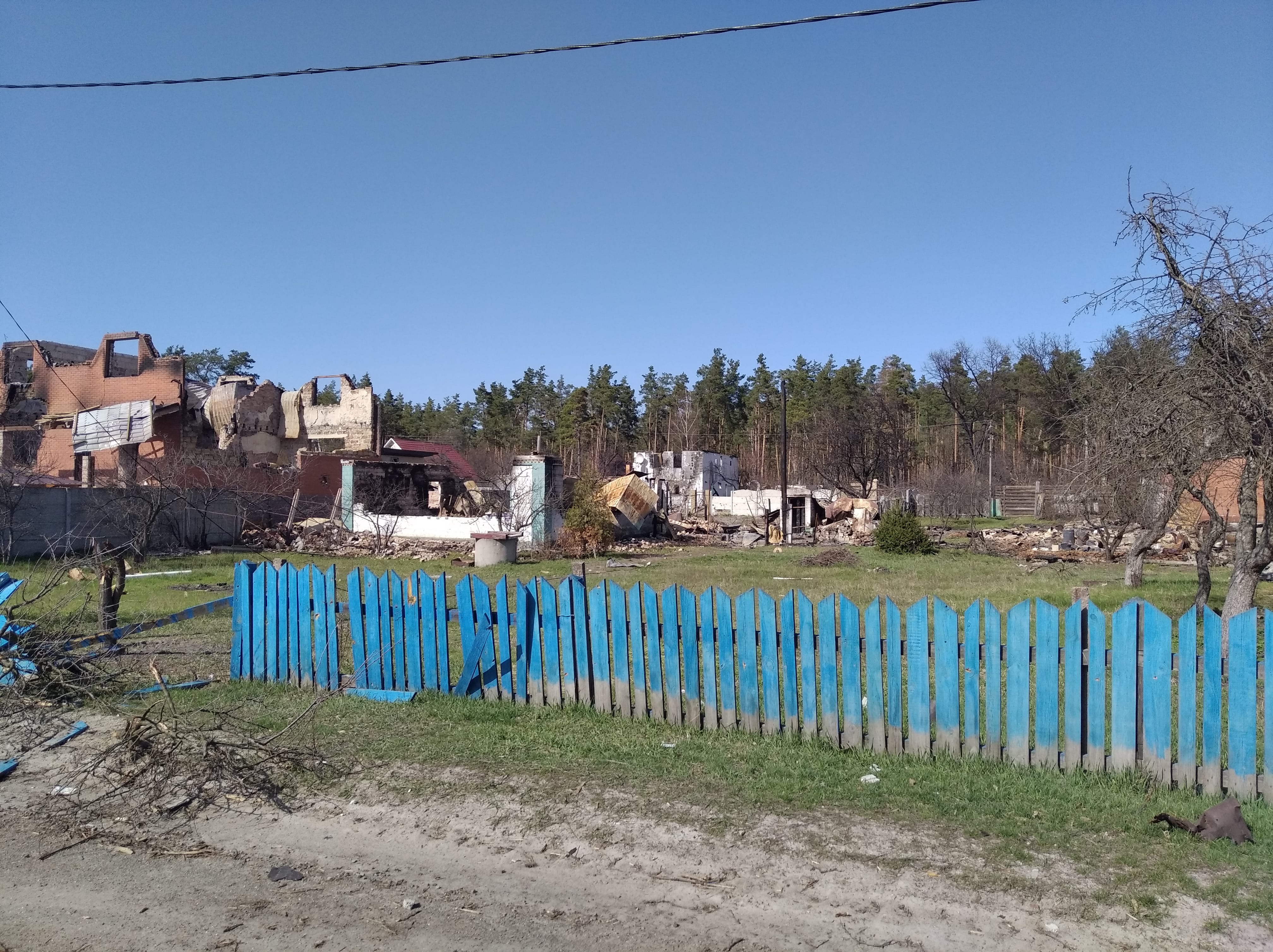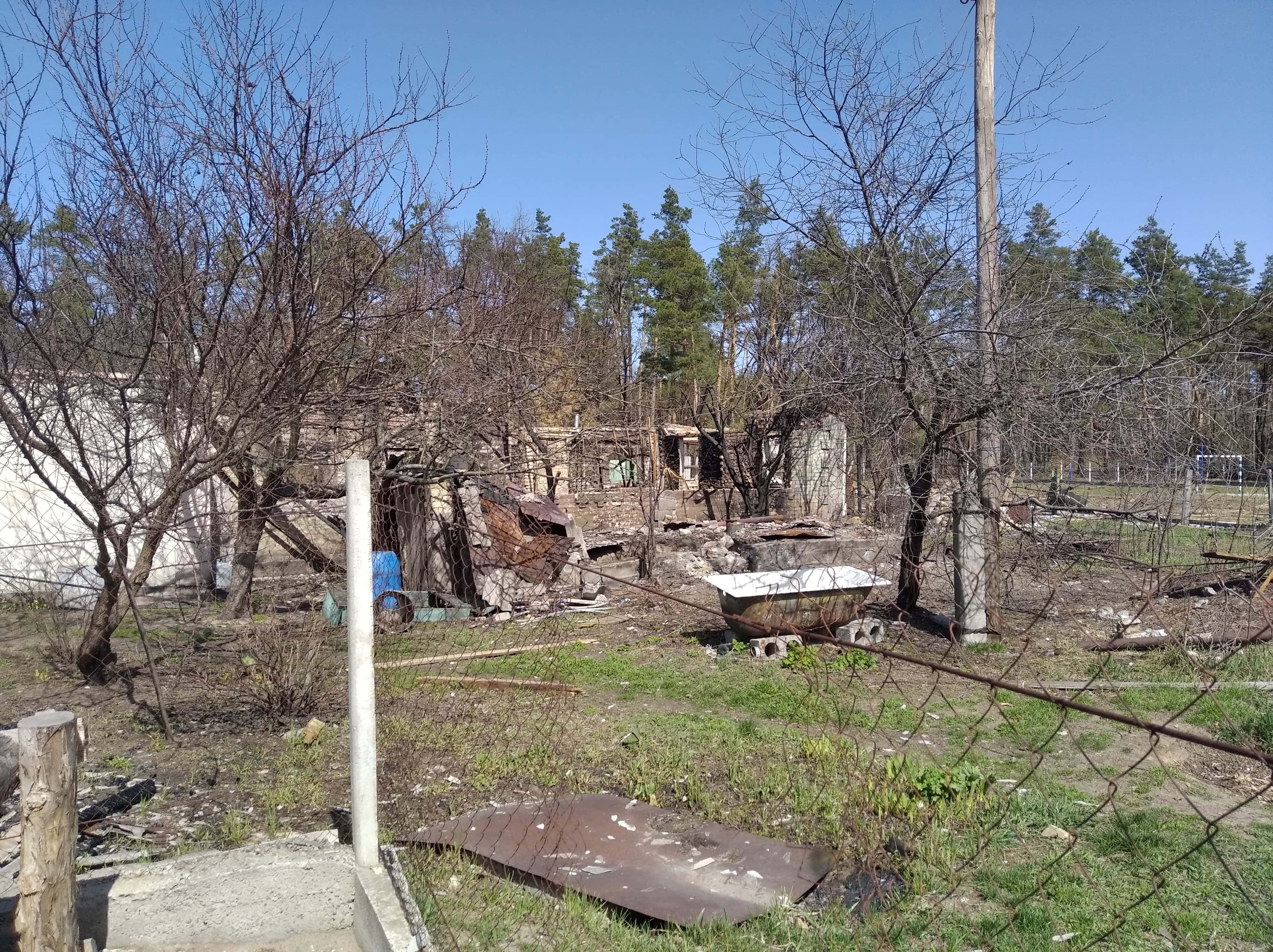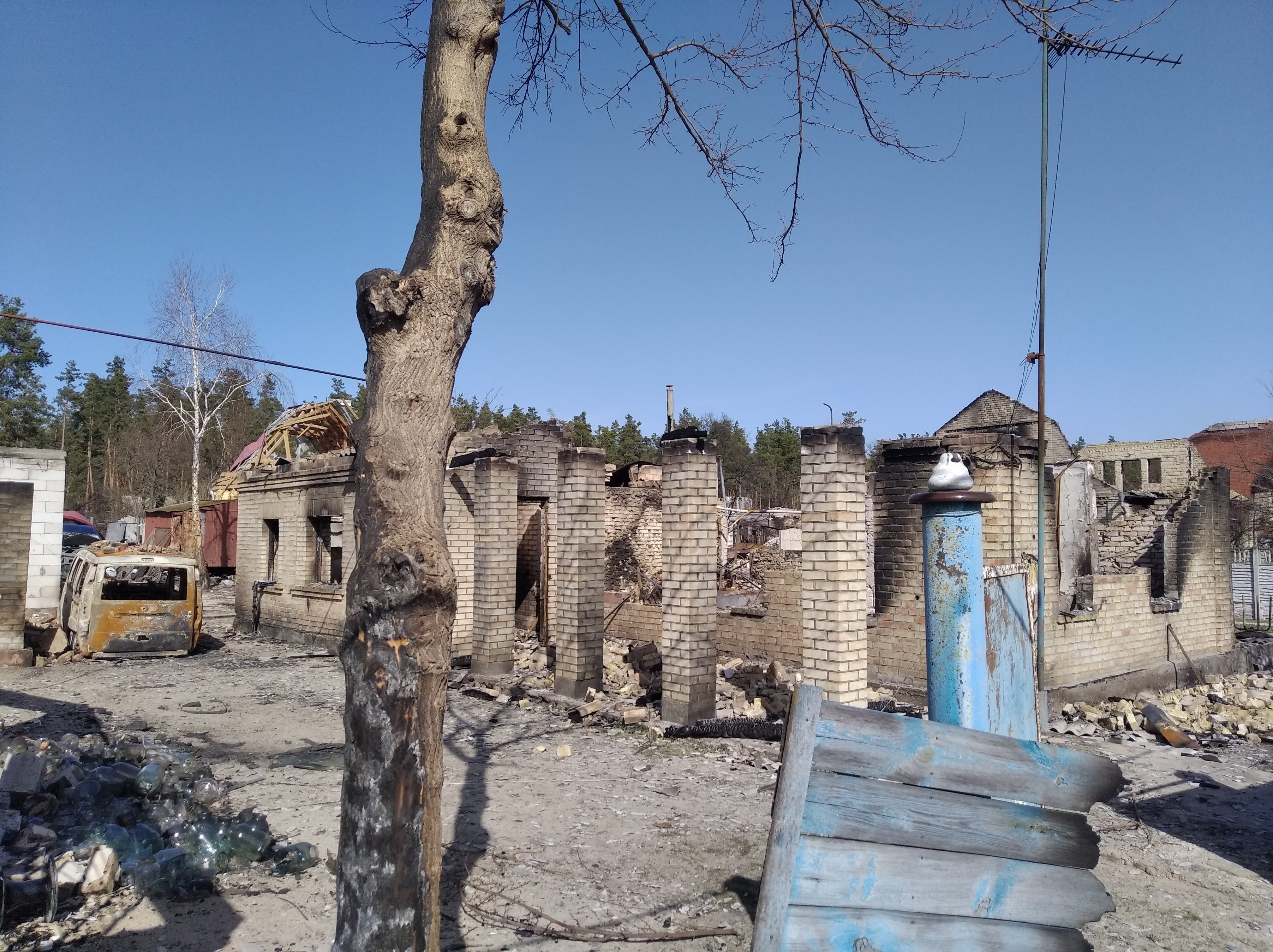 Знищені будинки, розбиті автівки, понівечені дороги, зруйновані могили на цвинтарі, повалені дерева, розкидані рештки снарядів, трупи загарбників та закатованих і вбитих осколками мешканців — так виглядало село наприкінці березня, коли росія почала відводити війська з Київщини.