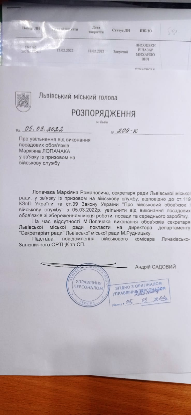 Після 24 лютого у депутатському корпусі не відбулося жодних структурних змін, міжфракційних переходів чи складання депутатських мандатів. Водночас варто звернути увагу на одну важливу кадрову проблему — вивільнення посади секретаря Львівської міської ради, яку обіймав МаркіянМаркіян Лопачак. На початку березня він пішов добровольцем до лав Збройних Сил України, а тому склав обов’язки секретаря ради. Посада опинилася в підвішеному стані. 5 березня Андрій Садовий підписав розпорядження №200, яким у зв’язку із призовом на військову службу Маркіяна Лопачака розпорядився «увільнити від виконання посадових обов’язків із збереженням місця роботи, посади та середнього заробітку». На час відсутності його обов’язки покладено на директорку департаменту «Секретаріат ради» Марту Рудницьку.