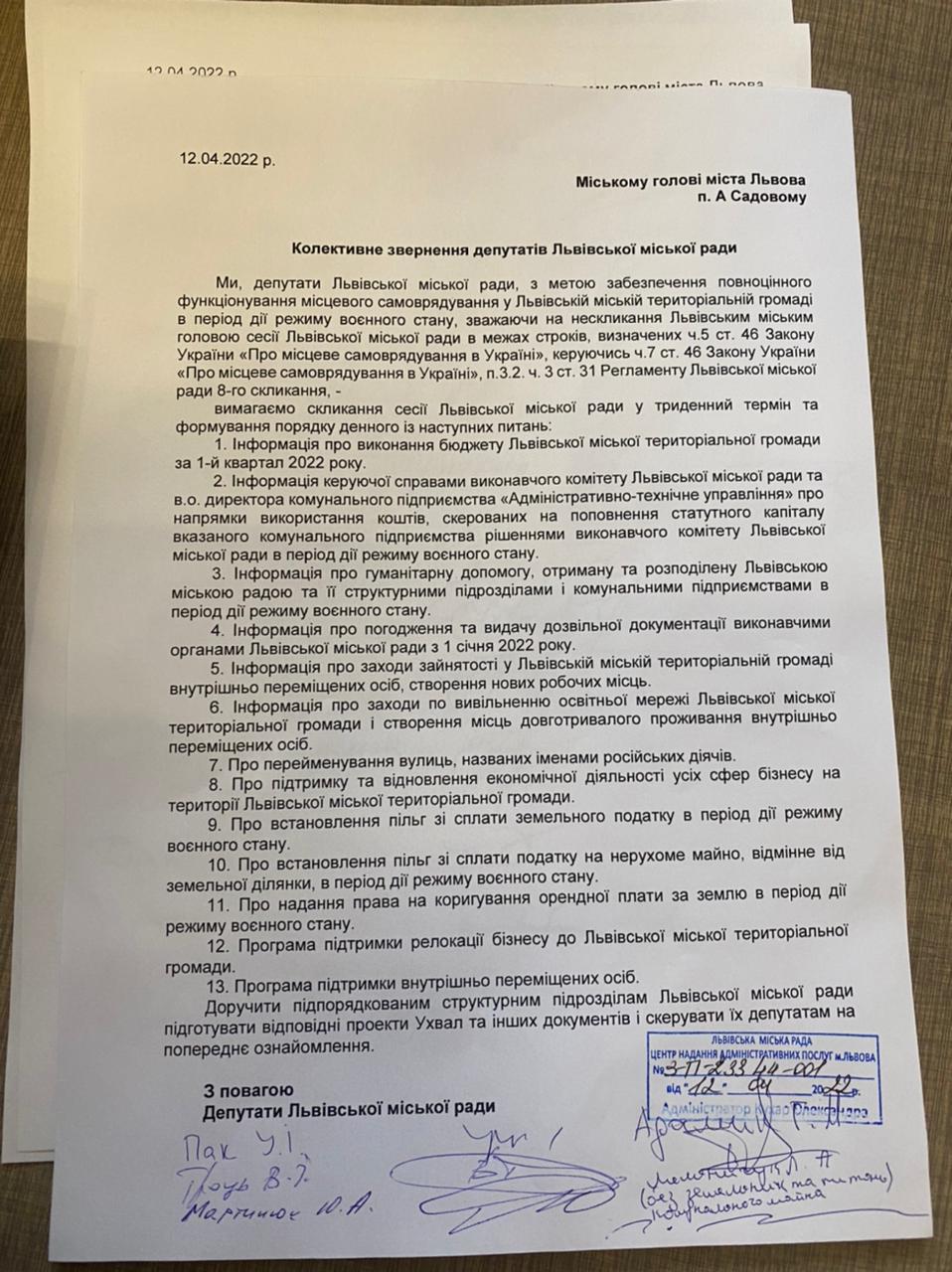 12 квітня міському голові Андрію Садовому скерували колективне звернення за підписом 23 депутатів із чотирьох фракцій. У ньому вони «вимагають скликання сесії Львівської міської ради у триденний термін та формування порядку денного» «з метою забезпечення повноцінного функціонування місцевого самоврядування у Львівській міській територіальній громаді в період дії режиму воєнного стану». У цьому листі зазначено 13 питань, сформованих на основі висловлених побажань депутатів фракцій, які у ньому підписалися. Серед ініціаторів — переважна більшість членів фракцій «Європейська Солідарність» і «Варта», а також голови фракцій «Голос» і ВО «Свобода». За словами ініціаторів, вони не отримали відповіді від міського голови на своє звернення, а сесія міської ради так і не відбулася.