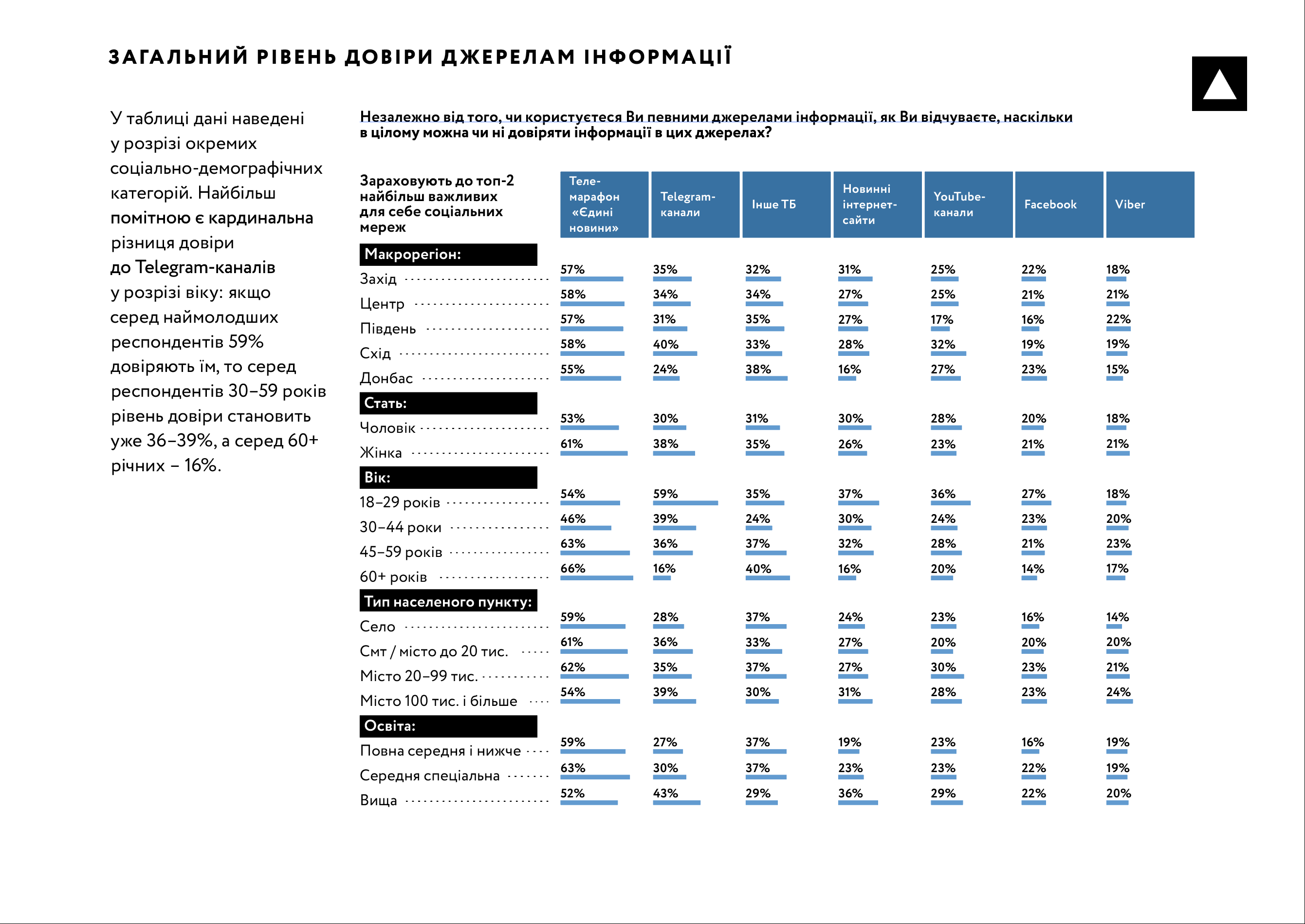 Якщо ж звернути увагу на відмінності у довірі до певних видів ЗМІ між різними категоріями населення, то найбільш помітною є різниця у ставленні до Telegram-каналів серед різних вікових груп. Якщо серед наймолодших респондентів 59% довіряють їм, то у респондентів 30–59 років рівень довіри становить уже 36–39%, а серед категорії 60+ – 16%. Натомість телемарафону “Єдині новини” довіряють від 54% до 66% респондентів усіх вікових груп.