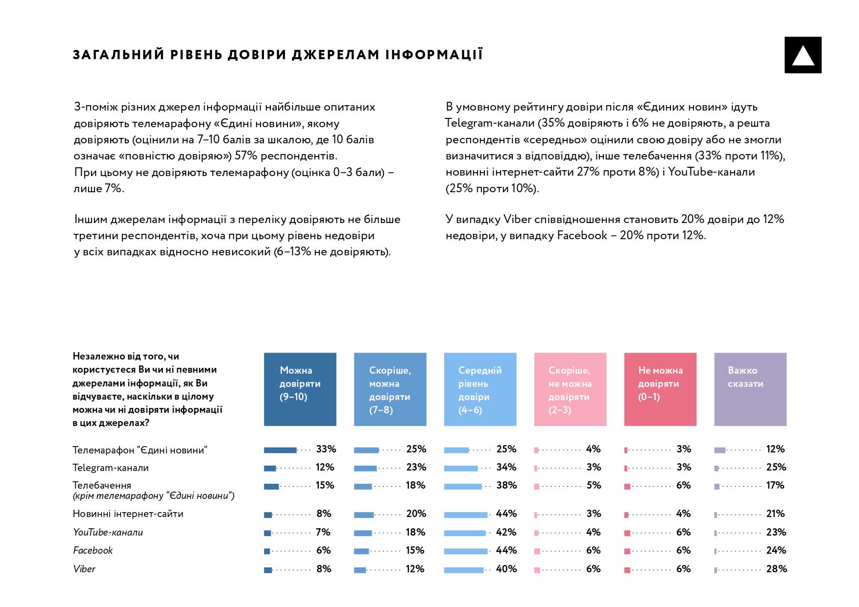 Разом з тим, за результатами опитування, найбільше респондентів довіряє телемарафону «Єдині новини». Його оцінили на 7–10 балів за шкалою, де 10 балів означає «повністю довіряю», 57% респондентів. При цьому не довіряють йому (оцінка 0–3 бали) лише 6%. Іншим джерелам інформації довіряють не більше ніж 30% опитаних. Умовний «рейтинг довіри» після «Єдиних новин» формують: