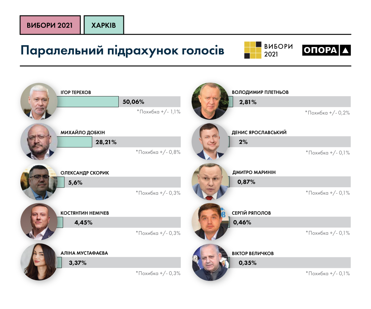 На основі статистично обгрунтованої вибірки ОПОРА проводила спостереження впродовж всього дня голосування на 220 дільницях міста Харкова. В результаті спостереження і даних з 99% цих дільниць отримано такі результати паралельного підрахунку голосів.