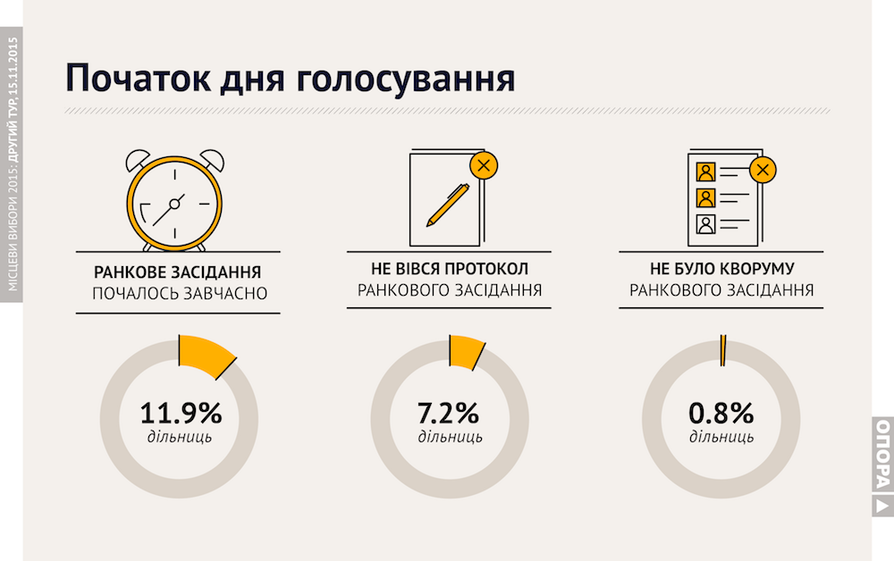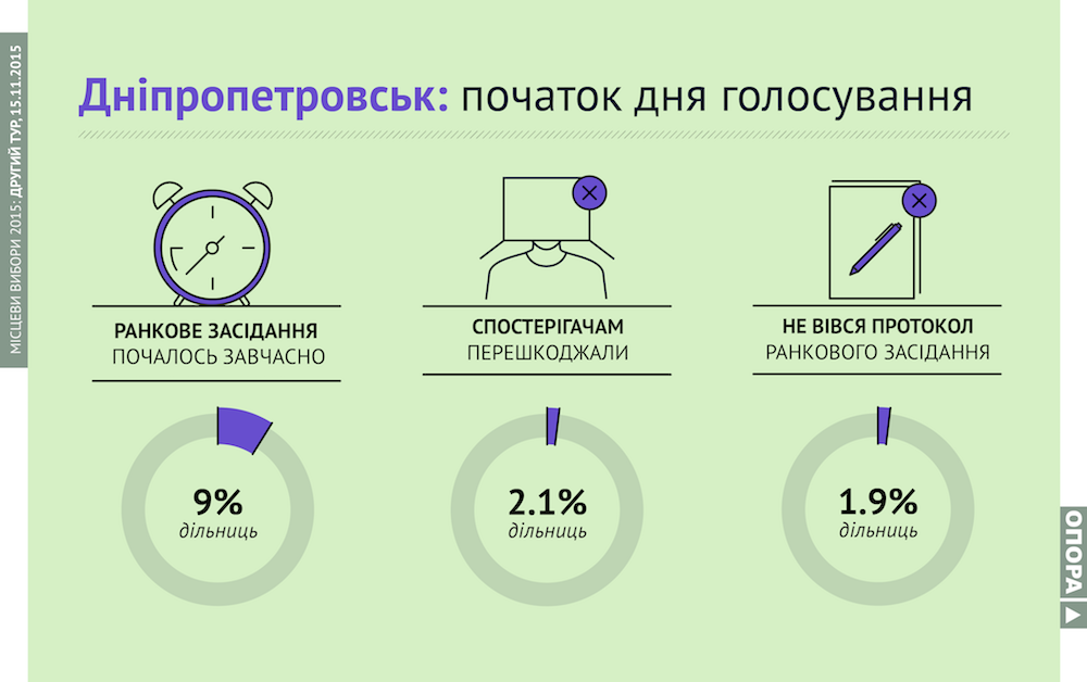За даними спостерігачів ОПОРИ, які представлені на репрезентативній для усієї країни кількості виборчих дільниць, 11,5% дільничних виборчих комісій по Україні розпочали свої підготовчі засідання раніше 7 год.15 хв. Це менша кількість, порівняно з першим туром голосування, коли ранкові засідання раніше встановленого законом часу відбулися на 17% дільниць. У місті Дніпропетровську всього 9% виборчих дільниць почали підготовче засідання раніше встановленого часу, тоді як 25 жовтня таких було 12,4%. Закон України «Про місцеві вибори» чітко встановлює, що підготовчі засідання ДВК мають розпочатися не раніше ніж за 45 хвилин до початку голосування.