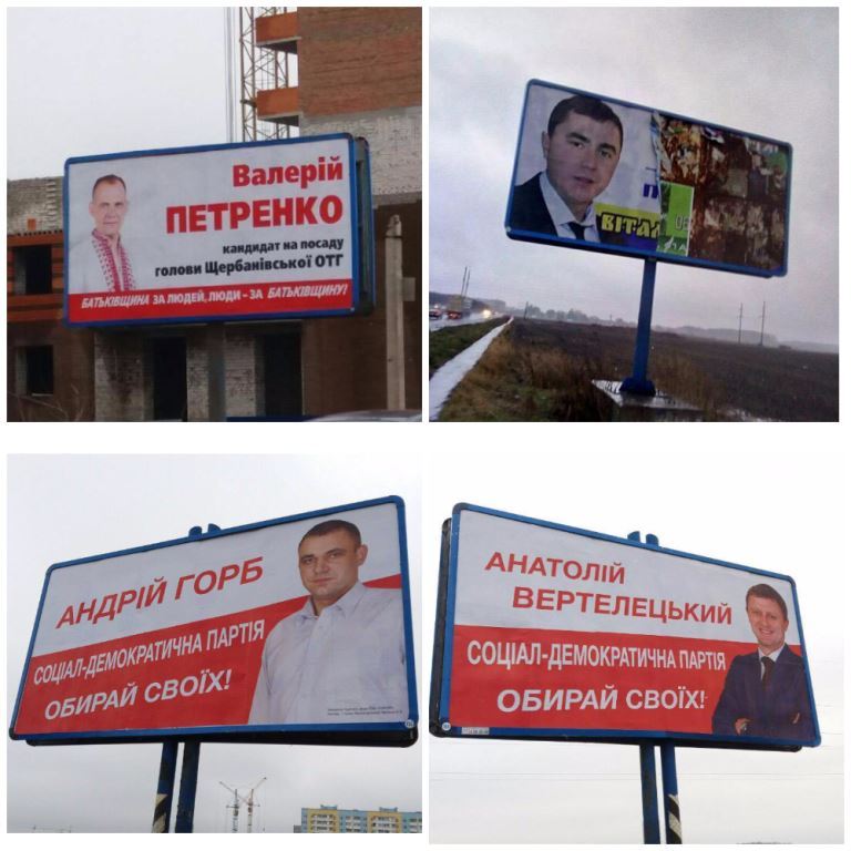 Тож на сьогодні по території Щербанівської громади можна зустріти політичну рекламу від кандидатів на посаду сільського голови Валерія Петренко (ВО «Батьківщина») до нещодавно були біг-борди Віталія Діденка (Політична партія «Патріот»), а також кандидатів у депутати від Соціал-демократичної партії Андрія Горба та Анатолія Вертелецького.