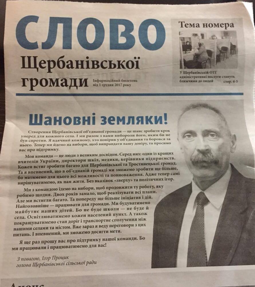 Спочатку в газеті «Слово Щербанівської громади» на першій сторінці було опубліковане звернення голови Щербанівської сільської ради Ігора Процика. Він говорить про своє балотування, готовність команди, а також закликає кожного громадянина його підтримати.