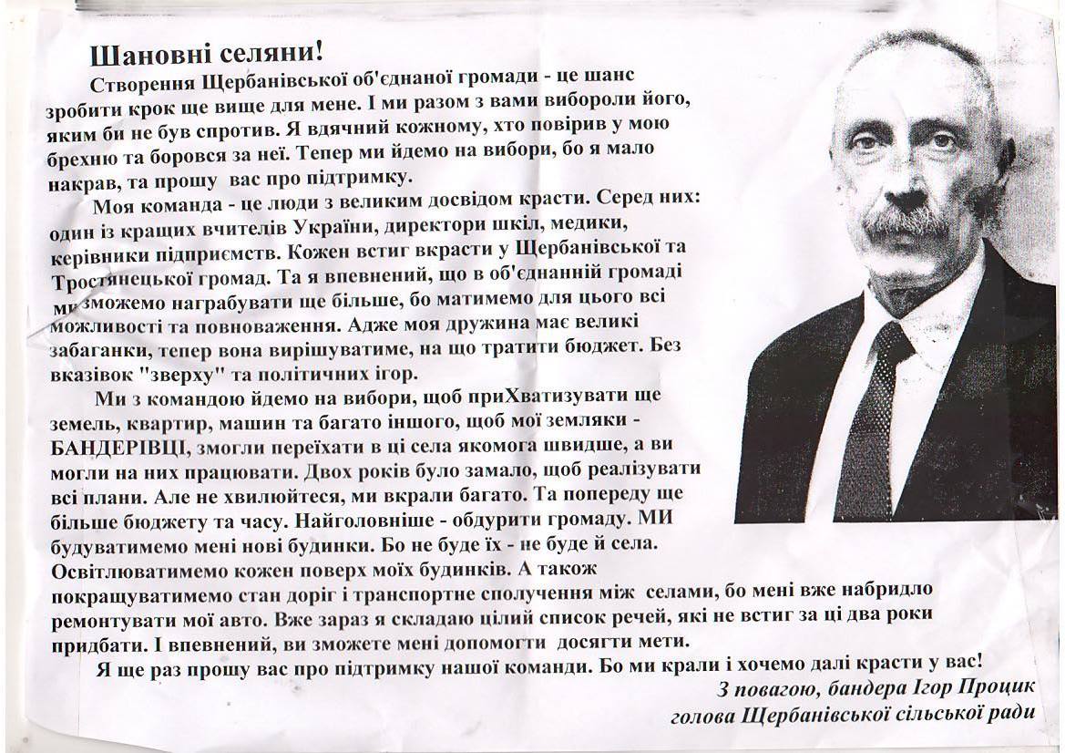Проте після того, на території громади почали з`являтись нові листівки, які пародіюють звернення голови сільради. Листівка була підписана «бендера Ігор Процик…», а в самому тексті від першої особи зазначено «я мало накрав, то прошу вас про підтримку…» в деяких рядках зустрічається саркастичне викривлення слів «ми з командою йдемо на вибори, щоб приХватизувати ще земель…» і т. д.