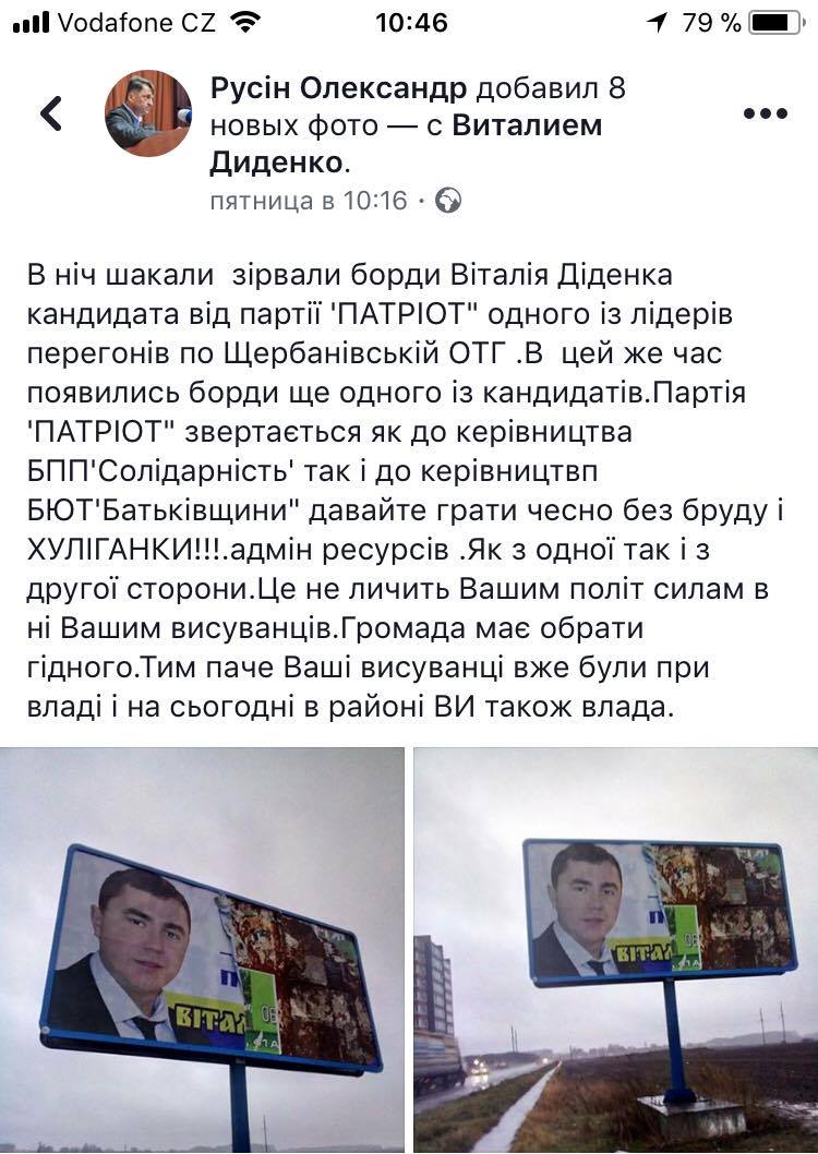«Брудні технології вже розпочались на території громади. Окрім того, що зняли наші біг-борди, раніше були вже розклеєні листівки проти нашого кандидата. І це все не дивлячись на те, що ми все робимо по законодавству. Ми зареєструвались у числі перших, відкрили виборчий фонд і з нього проплатили борди. Вони містили вихідні дані, проте, їх зірвали. Наразі ми працюємо «від хати до хати» і просимо людей підтримати нашого кандидата, а також розповсюджуємо листівки, надруковані на принтері з програмою нашого кандидата» - зазначив Олександр Русін.
