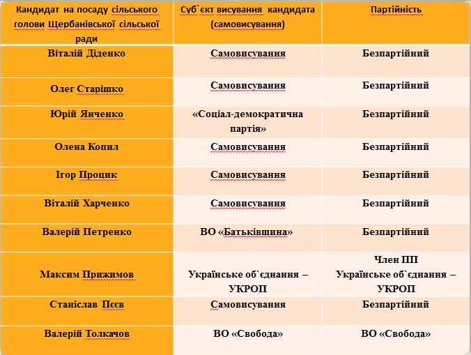 ЗАРЕЄСТРОВАНО 10 КАНДИДАТІВ НА ПОСАДУ ГОЛОВИ ТА 226 КАНДИДАТИ У ДЕПУТАТИ ЩЕРБАНІВСЬКОЇ СІЛЬСЬКОЇ РАДИ