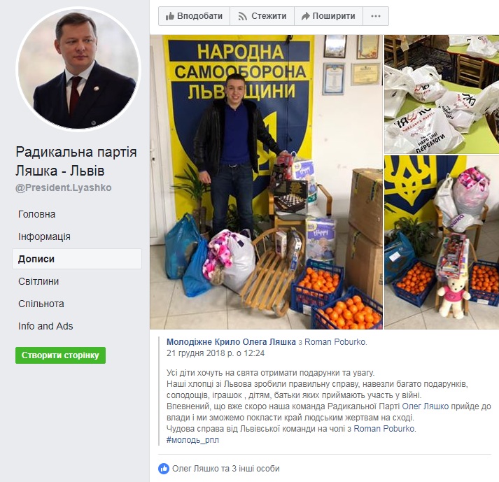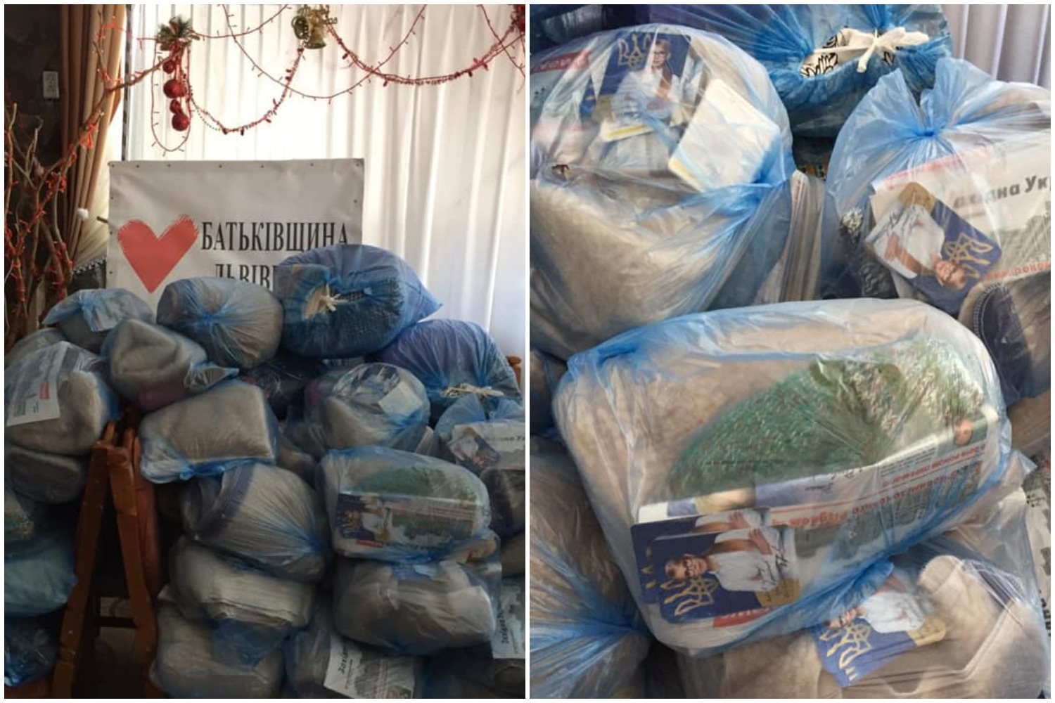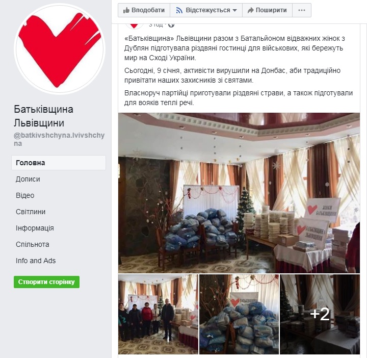 На сторінці «Батьківщина Львівщини» у Facebook з’явився допис про те, що партійці обласного осередку ВО «Батьківщина» разом з громадською організацією «Батальйон відважних жінок» передали різдвяні подарунки воїнам ООС (Операції об’єднаних сил — колишня АТО). На фото під публікацією можна розгледіти, що окрім різдвяних страв та теплих речей до пакунків поклали календарі з фото Юлії Тимошенко та привітанням від її імені, а також партійні газети.