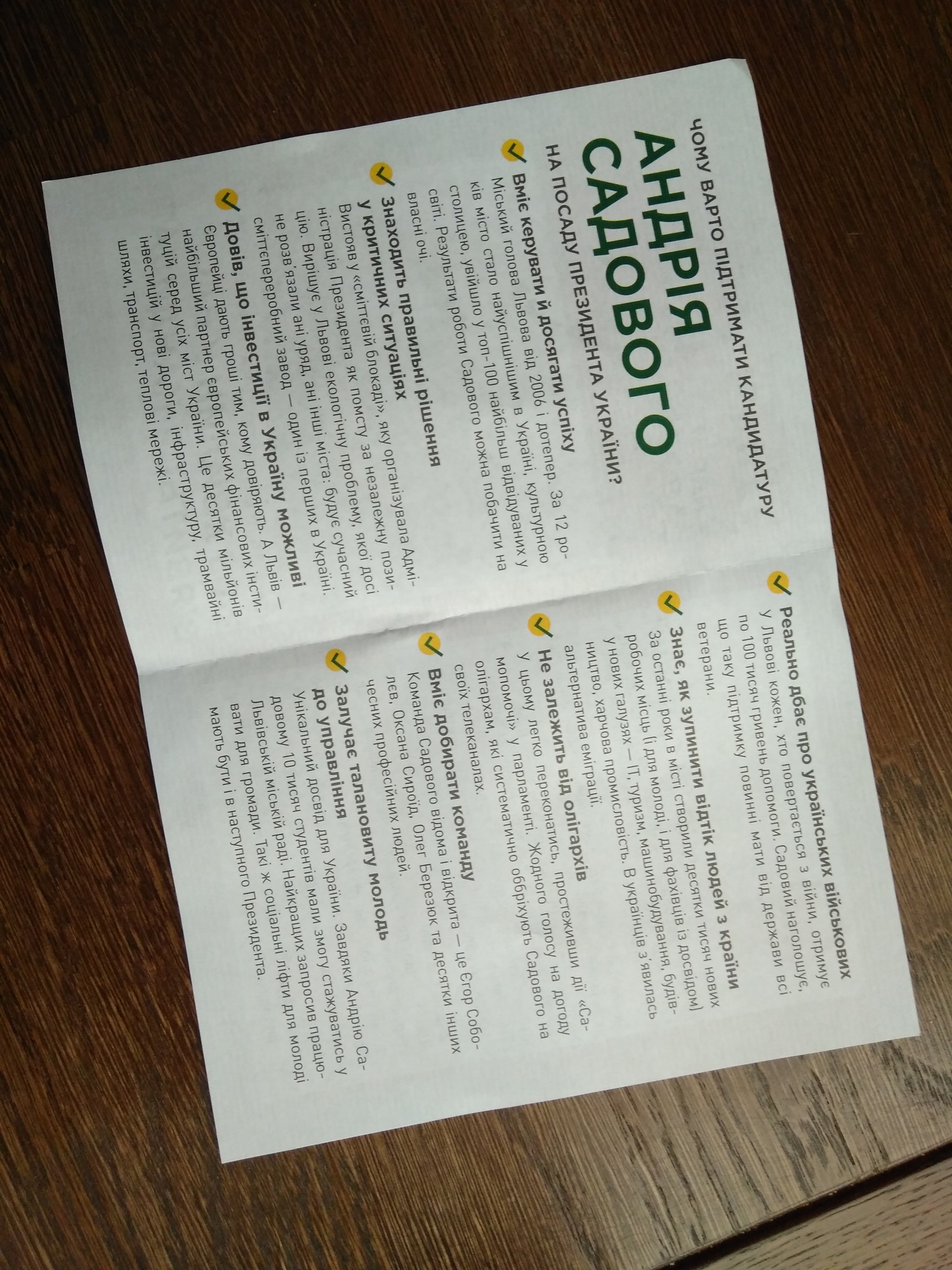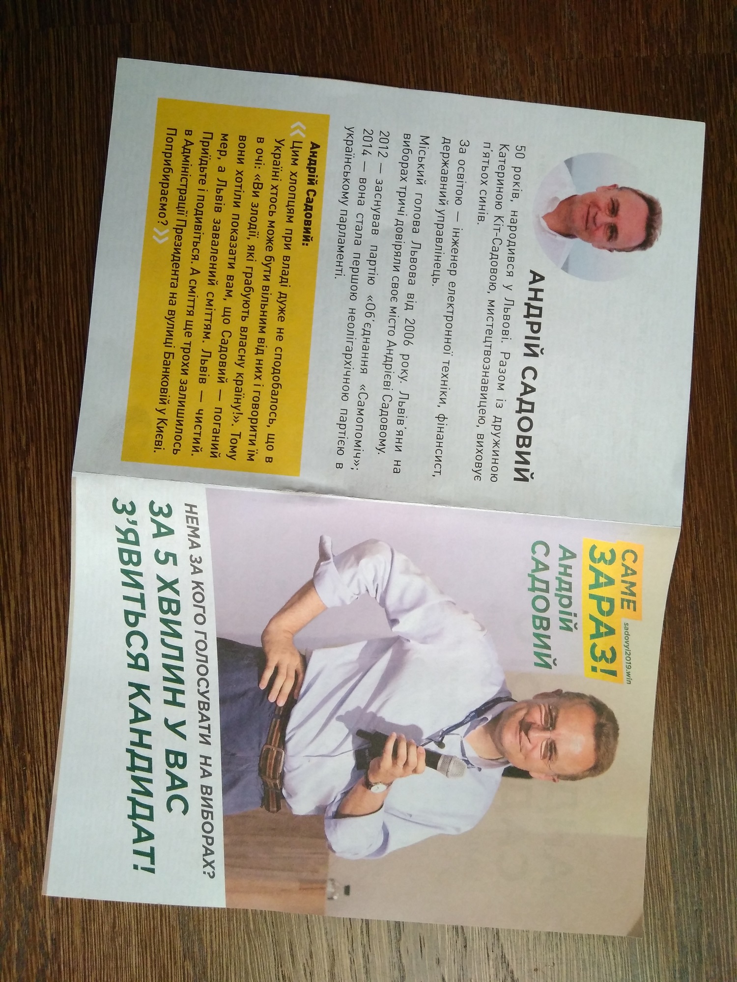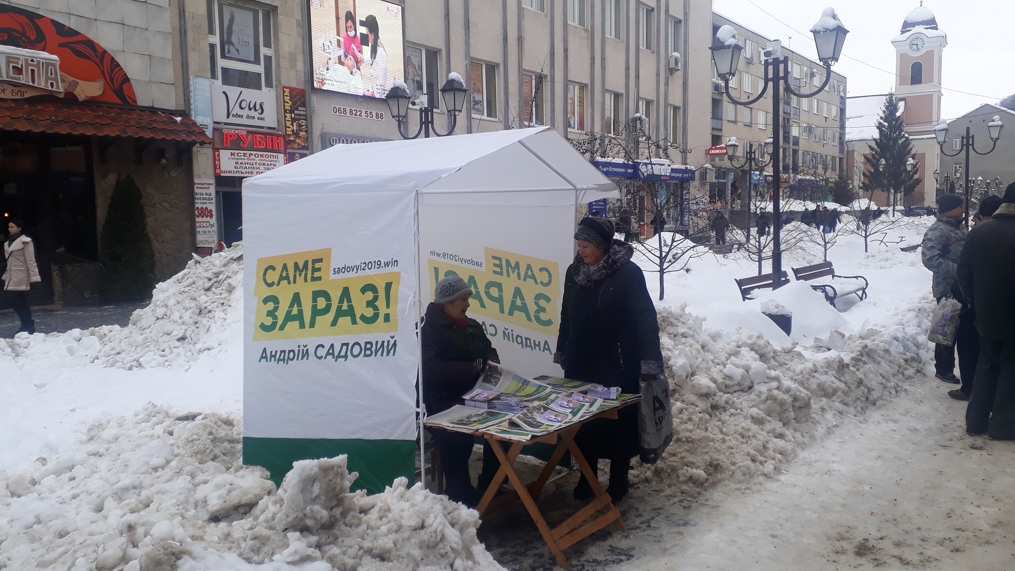 Крім цього, у Хусті спостерігачі ОПОРИ 15 січня зафіксували у наметі з іменем Андрія Садового роздачу агітаційних листівок кандидата у Президенти Андрія Садового також без вихідних даних.