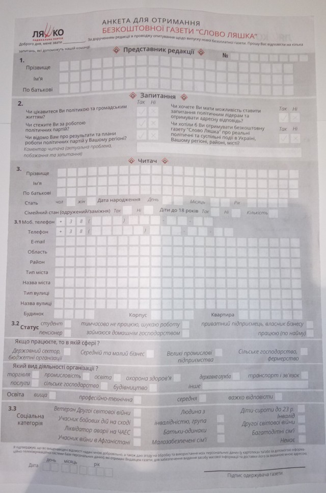 У місті Шаргород в районному осередку Радикальної партії Олега Ляшка мешканцям пропонують заповнити анкету, аби безкоштовно отримувати газету «Слово Ляшка». Про це повідомляє спостерігач Громадянської мережі ОПОРА.