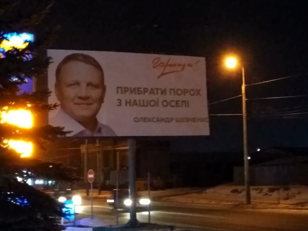 Спостерігачі виявили білборд із зображенням зареєстрованого кандидата Олександра Шевченка та гаслом «Гарантую! Прибрати порох з нашої оселі» без вихідних даних. Рекламний щит розміщений на вул. Текстильній у місті Тернополі.