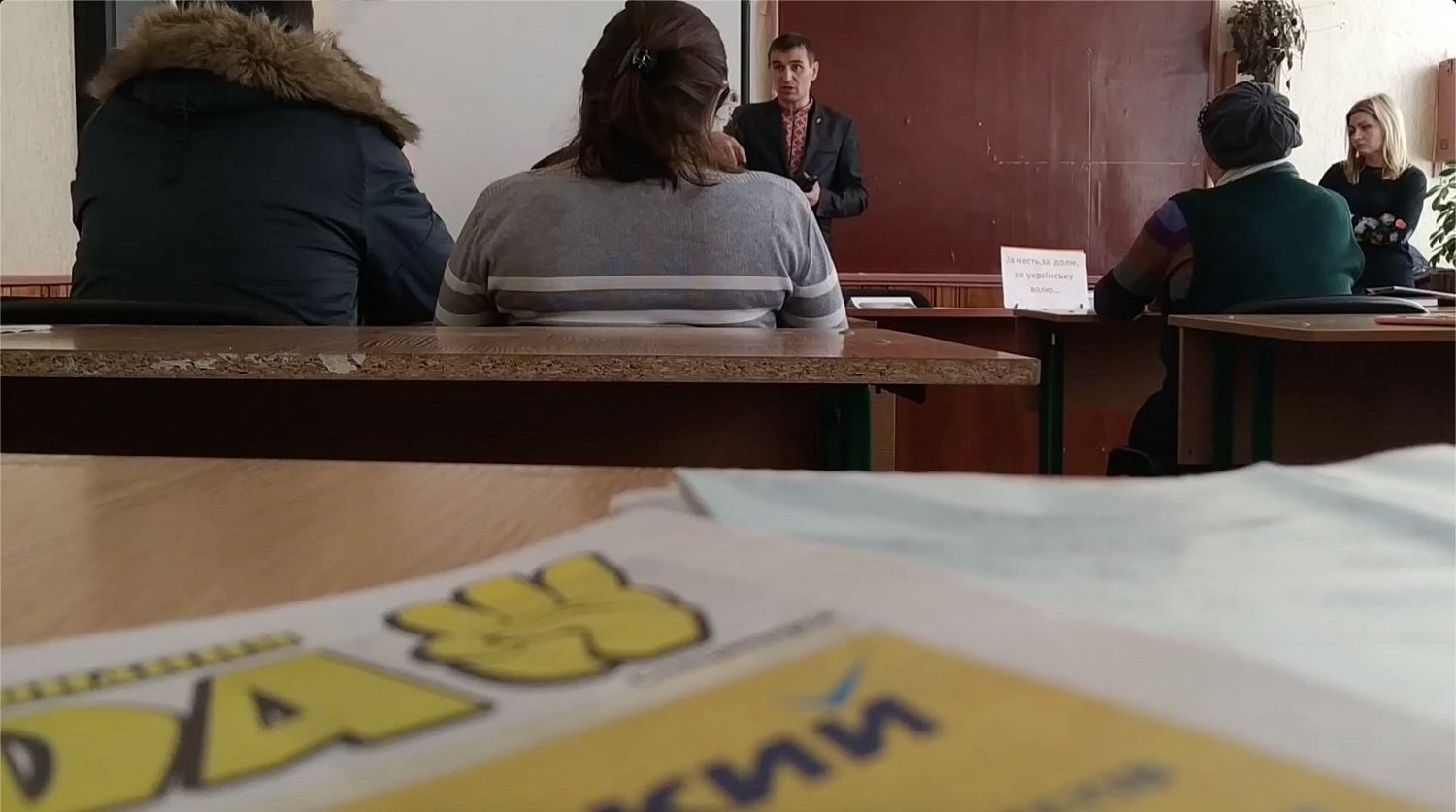Як заздалегідь повідомили вчителям у відділі освіти Віньковецької РДА, мета візиту - провести урок патріотичного виховання для старшокласників. На "Уроці мужності" йшлося про події Революції Гідності, учасником якої був Юрій Кравчук. Однак після уроку гість попросив зібрати вчителів школи. Під час бесіди з педагогами, яка тривала перерву і частково урок - з 10:45 до 11:15, Юрій Кравчук роздавав спецвипуск газети "Всеукраїнське об'єднання Свобода", який повністю присвячений кандидатові на пост Президента України Руслану Кошулинському та містить, зокрема, розлоге інтерв’ю з політиком, його біографію, публікацію «7 причин віддати голос за Руслана Кошулинського». На останній шпальті видання вказано, що його замовником є кандидат на пост Президента України Кошулинський Р. В., а також зазначено інші вихідні дані, які повинні містити друковані матеріали передвиборної агітації відповідно до ч. 3 ст. 59 Закону України «Про вибори Президента України».