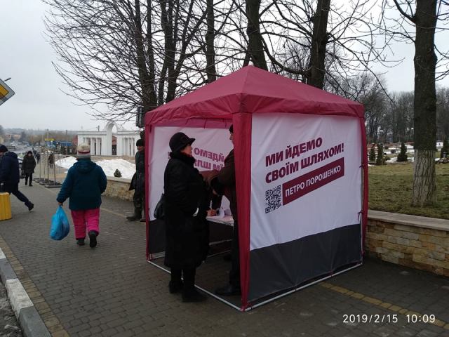 16 лютого намет, у якому роздають агітаційні матеріали та пропонують заповнити анкети, розміщено у місті Вінниця на площі Гагаріна.