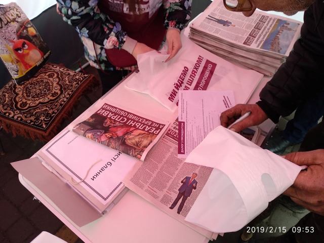 15 лютого у місті Тростянець у наметі, розташованому на вулиці Соборній, зафіксовано розповсюдження агітаційних матеріалів на користь кандидата у Президенти України Петра Порошенка. Крім того, в наметі пропонують заповнити анкету прихильника. В анкеті під назвою «Діалог з Президентом» ставляться такі запитання: «Які із досягнень Президента України Петра Порошенка для Вас найважливіші? Які, на Вашу думку, найважливіші завдання для Петра Порошенка після обрання його Президентом України? Як Ви ставитеся до Президента України Петра Порошенка?».