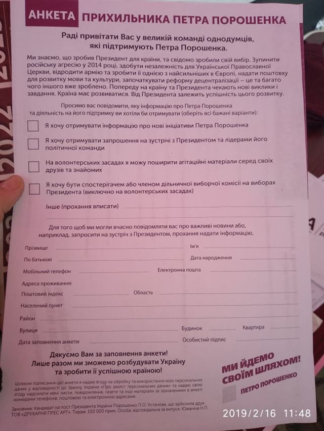 Якщо на питання «Як Ви ставитеся до Президента України Петра Порошенка?» респондент відповідає «Добре» або «Дуже добре», то пропонується заповнити ще одну анкету, в якій запитується, чи бажає особа отримувати інформацію про нові ініціативи Петра Порошенка, запрошення на зустрічі з Президентом та лідерами його політичної команди, може на волонтерських засадах поширити агітаційні матеріали серед своїх друзів та знайомих, хоче бути спостерігачем або членом дільничної виборчої комісії на виборах Президента (виключно на волонтерських засадах). Далі для отримання інформації пропонується залишити контактні дані (прізвище, ім’я, по-батькові, дата народження, адреса проживання, мобільний телефон, електронна пошта, адреса проживання тощо).