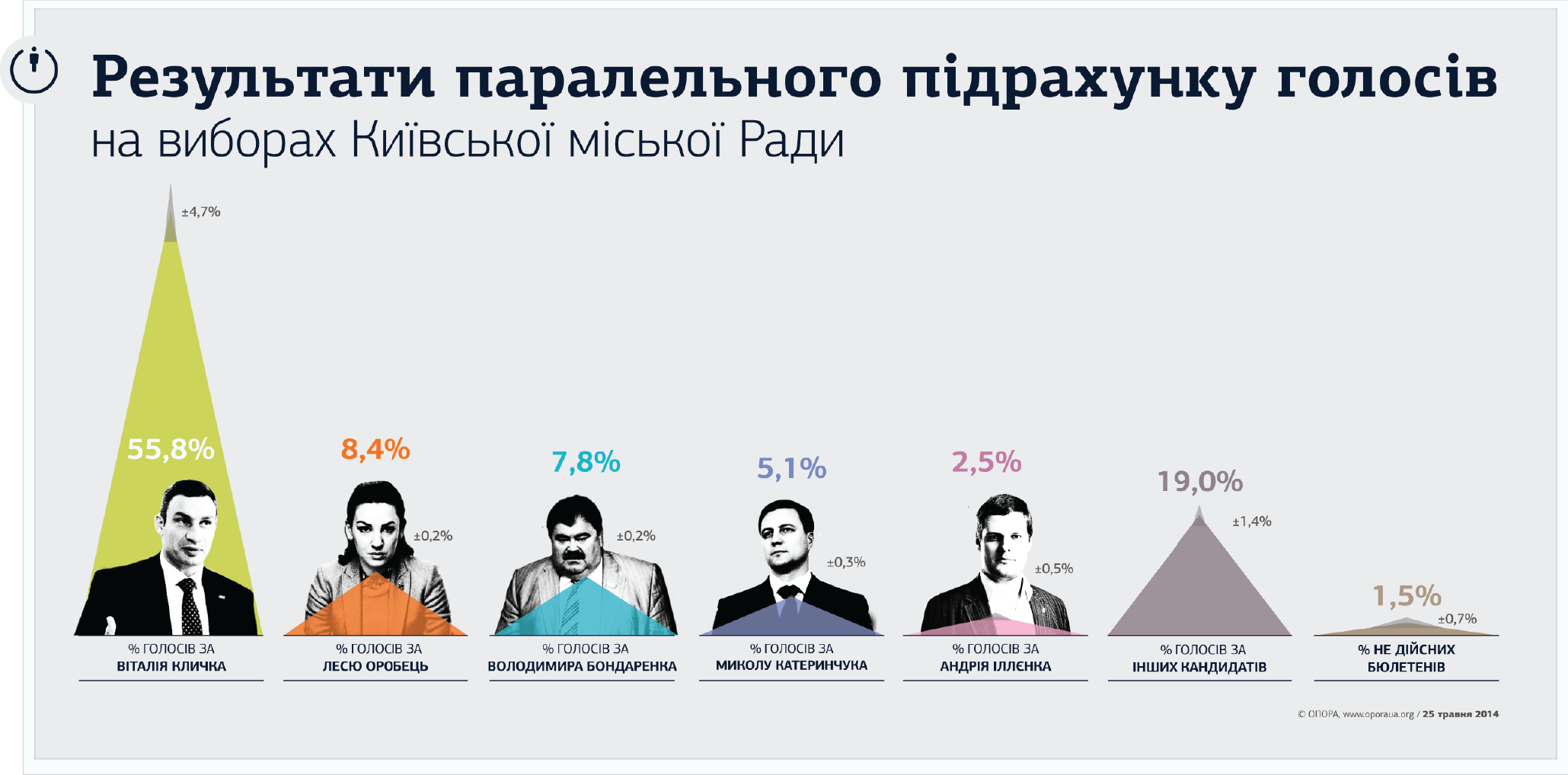 Базуючись на звітах від 500 наших ППГ спостерігачів, ОПОРА презентує такі результати виборів Київського міського голови, які були встановлені за результатами паралельного підрахунку голосів з максимальною похибкою 4,7 %: