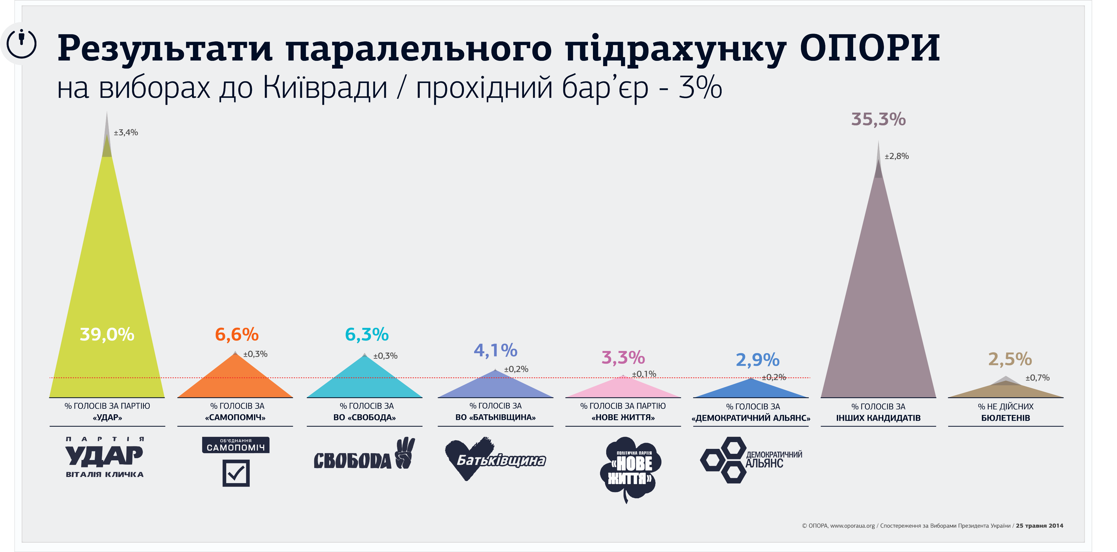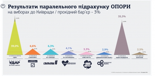 25 травня ОПОРА організувала паралельний підрахунок голосів на основі репрезентативної та статистично обґрунтованої вибірки на виборах до Київської міської ради. 500 дільниць стали полем дослідження, а максимальна похибка результатів не перевищує 3,4 %.