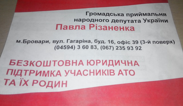 Павло Різаненко у 2012 році висувався як мажоритарник від партії «УДАР» по 97 окрузі з центром у Броварах. Станом на зараз він теж не зареєстрований як кандидат. Водночас, активізував свою діяльність на окрузі. Зокрема, в Броварах поширюються листівки про безкоштовну юридичну підтримку учасників АТО громадською приймальнею Різаненка. На звороті листівки – інформація про Координаційний центр допомоги броварським військовим.