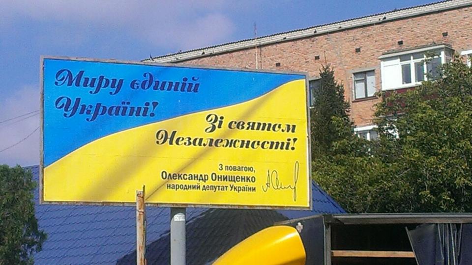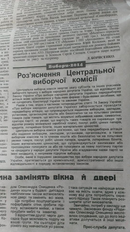 У 93 виборчому окрузі з центром у м. Миронівка у 2012 році від «Партії регіонів» балотувався Олександр Онищенко (22 лютого з фракції регіоналів у Верховній Раді вийшов і ввійшов до групи «Економічний розвиток»). Але методи схожі – зараз у місцевій газеті «Миронівський край» від 6 вересня 2014 року читаємо оголошення про те, як благодійний фонд «Родина» Олександра Онищенка встановить в дитсадку нові вікна і двері. Окрім іншого, до середини вересня по всьому місту були розміщені білборди з привітаннями до Дня Незалежності від пана Онищенка, а ще він обіцяв привезти у місто ветеранів «Динамо».