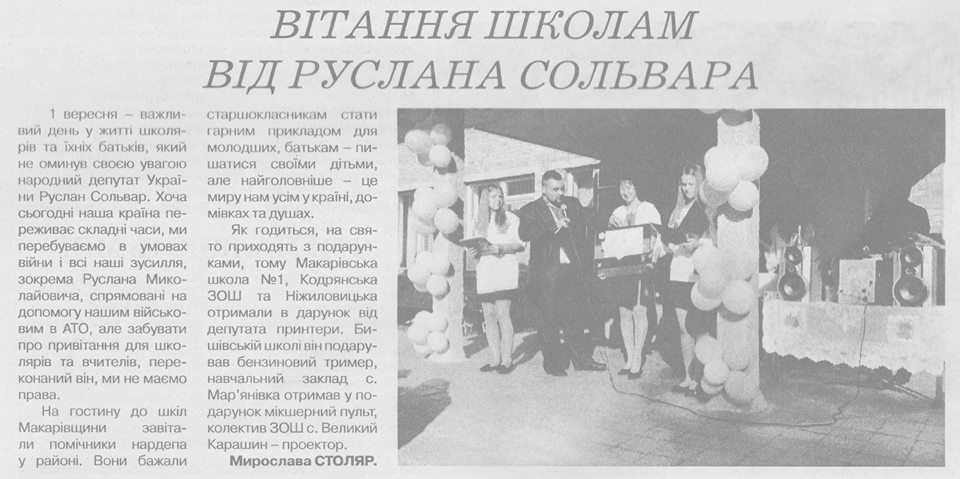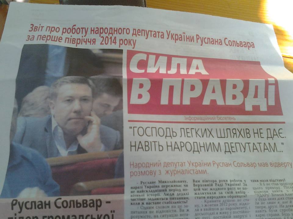 Так, в 91 окрузі на вулицях в смт Макарів активно розповсюджується інформаційний бюлетень «Сила в правді» про діяльність народного депутата Руслана Сольвара. У 2012 році він балотувався по цьому округу як висуванець від партії «УДАР». У газеті йдеться про надання безкоштовних юридичних консультацій у нещодавно відкритих громадських приймальнях, а також – про надання товарів і послуг виборцям через фонд Сольвара «Разом у майбутнє». Разом з тим у районній газеті «Макарівські ВІСТІ» за 12 вересня 2014 р. №35(10839) розміщена стаття про пана Руслана, де розповідається, як він подарував школам на Перший дзвоник принтери, бензиновий тример, мікшерний пульт і проектор. І, між іншим, про те, що його зусилля спрямовані на допомогу українським військовим в зоні АТО.