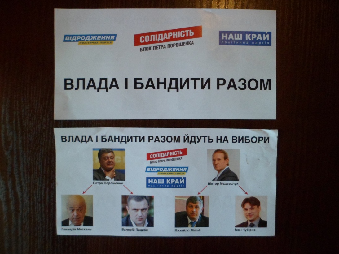 На одному варіанті листівок – логотипи трьох згаданих партій з написом – «Влада і бандити разом». На іншому – напис «Влада і бандити ідуть разом» та фотографії Президента України Петра Порошенка та екс-голови Адміністрації Президента Леоніда Кучми Віктора Медведчука.