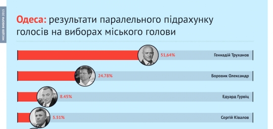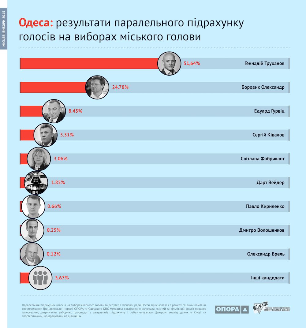 За даними паралельного підрахунку результатів голосування на основі 100% опрацьованих протоколів на виборах міського голови Одеси найбільше виборців проголосувало за Геннадія Труханова – 51.64% або ж 138353 голосів виборців, друге місце посідає Олександр Боровик – з результатом 24.78% або 66387 голосів виборців, третій у перегонах – Едуард Гурвіц, який здобув підтримку 8.45% (22631 голосів виборців).