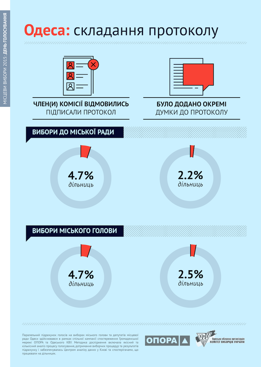 У день виборів ОПОРА використала комплексну та іноваційну стратегію розташування спостерігачів на виборчій дільниці. Всього ОПОРОЮ розподілила 623 спостерігача відповідно до вибірки репрезентативної на всеукраїнському рівні та на рівнях кожного з чотирьох регіонів: Захід, Центр, Схід та Південь. Це дозволило системно оцінити якість проведення дня голосування та порівняти регіони один з іншим. ОПОРА також розгорнула мережу PVT спостерігачів, щоб покрити всі виборчі дільниці у трьох містах: Харкові, Одесі та Дніпропетровську. У кожному з них PVT спостерігачі оцінювали якість процесу та проконтролювали результати виборів міського голови та міської ради. Спостерігачі не рахували жодних документів особисто і не запитували виборців про те, як вони проголосували. PVT – це незалежне спостереження, яке проводиться тільки ОПОРОЮ з наміром надати незалежну інформацію про точність офіційних результатів на виборах міських голів та місцевих рад у трьох містах.