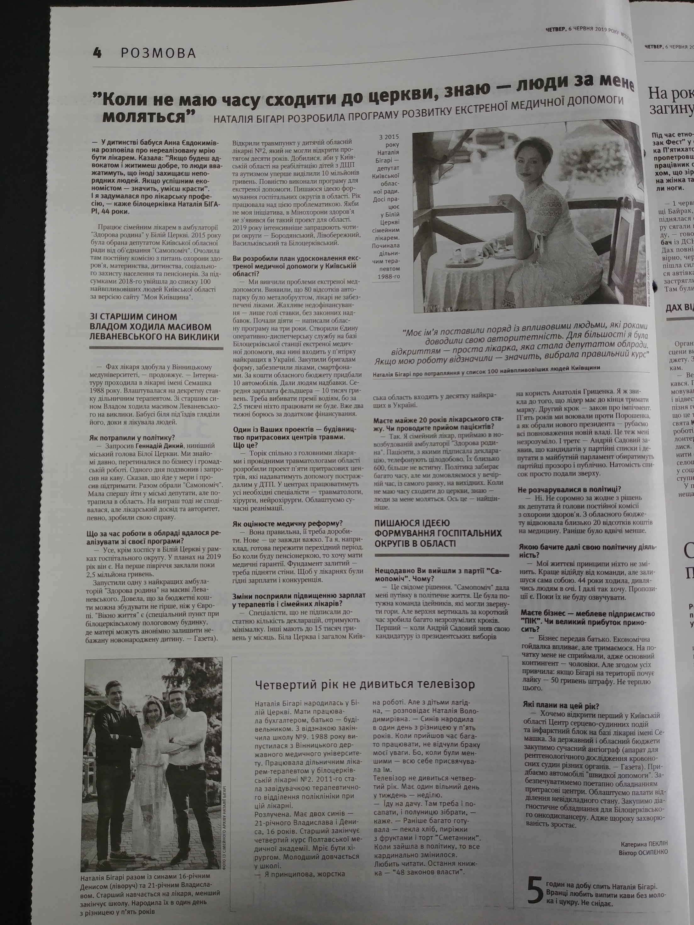 Білоцерківська «Газета по-українськи» 6 червня випустила матеріал з розлогим та компліментарним інтерв'ю з Наталією Бігарі. В ньому також йдеться, що вона розробила програму розвитку екстреної медичної допомоги у Київській області. Зазначимо, Наталія Бігарі є депутатом Київської обласної ради та екс-член Об’єднання «Самопоміч».