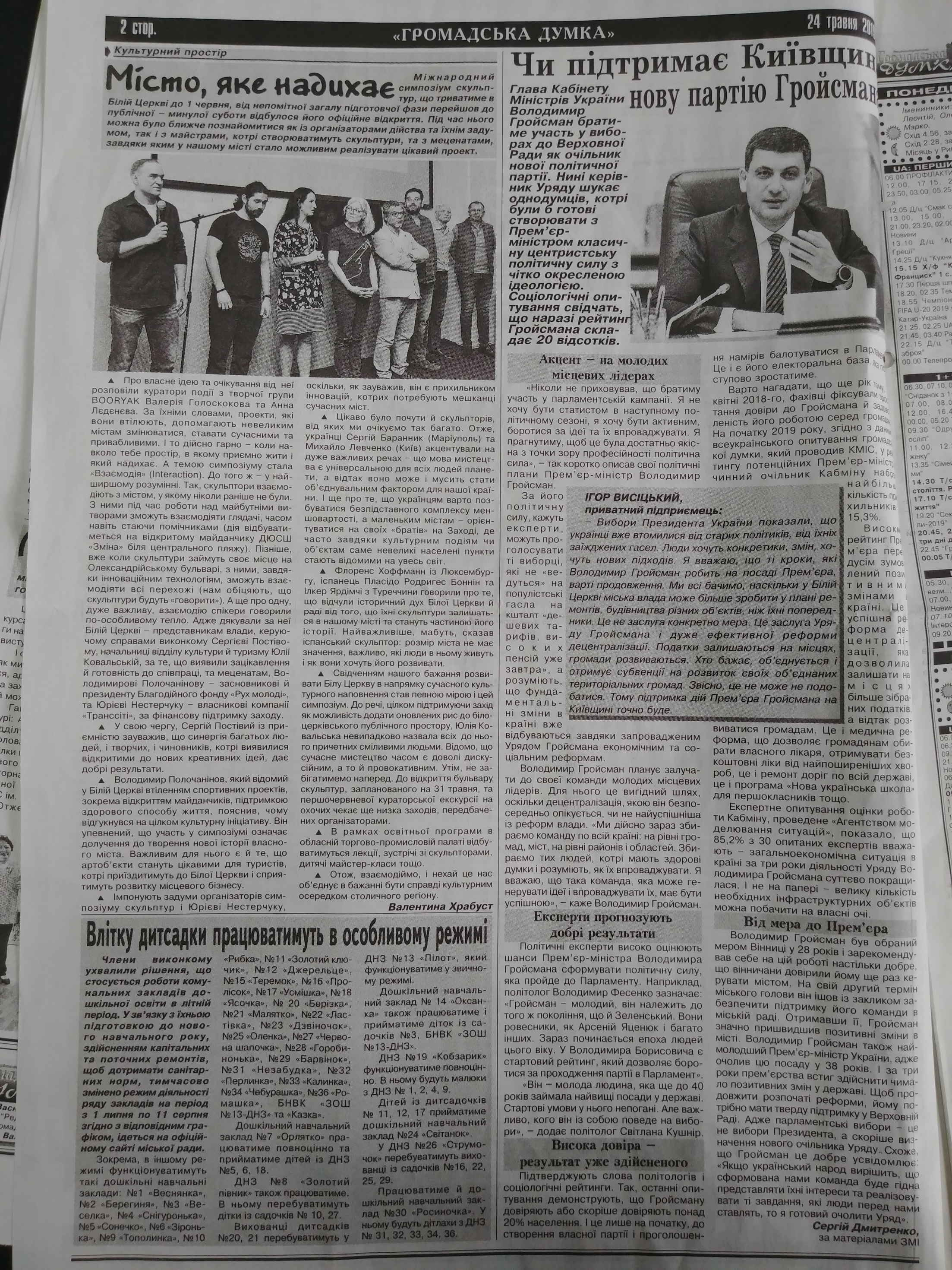 Кілька статей з ознаками дочасної агітації у газетах Білоцерківщини були опубліковані і у травні. Так, 24 травня в місцевій газеті «Громадська думка» опублікована стаття з ознаками політичної агітації щодо прем'єр-міністра Володимира Гройсмана та його політичну силу. Стаття називається «Чи підтримує Київщина нову партію Гройсмана», а на її початку йдеться «Глава Кабінету Міністрів України Володимир Гройсман братиме участь у виборах до Верховної Ради, як очільник нової політичної партії. Нині керівник Уряду шукає однодумців, котрі були б готові створювати з прем'єр-міністром класичну центристську політичну силу з чітко окресленою ідеологіє. Соціальні опитування свідчать, що наразі рейтинг Гройсмана складає 20 відсотків».
