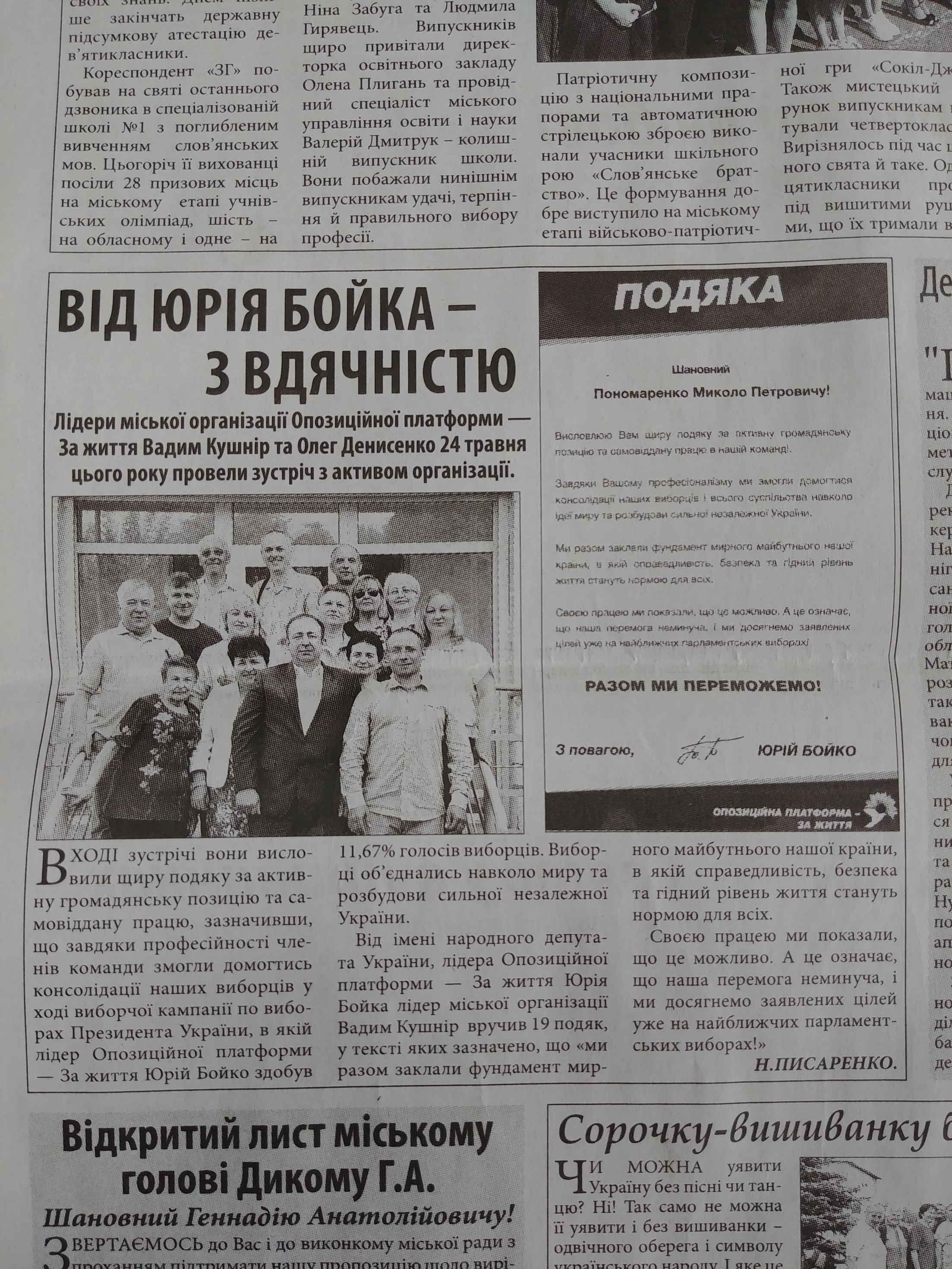 Також 31 травня в білоцерківській газеті «Замкова гора» є стаття з ознаками політичної агітації щодо Юрія Бойка, який очолює виборчий список «Опозиційної платформи – За життя». Матеріал називається «Від Юрія Бойка – з вдячністю», на початку статті йдеться «Лідери міської організації Опозиційної платформи За життя – Вадим Кушнір та Олег Денисенко цього року провели зустріч з активом організації». В статті також йдеться про вручення 19 подяк від імені Юрія Бойка.