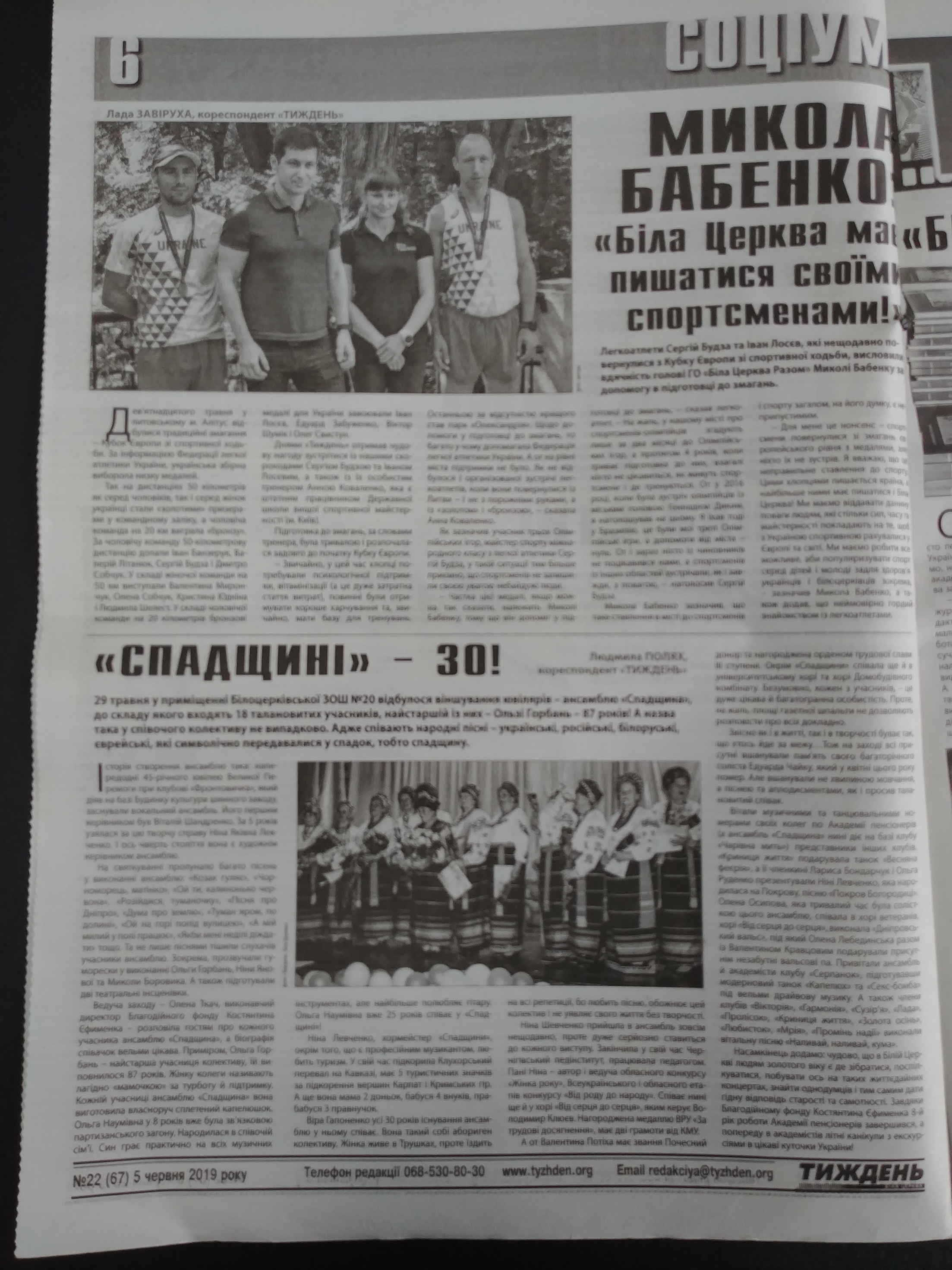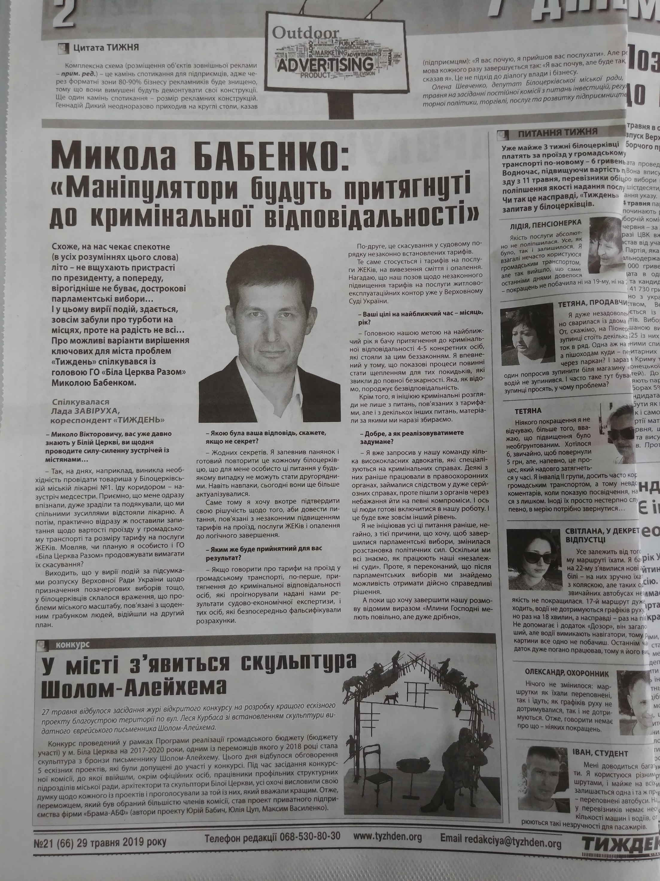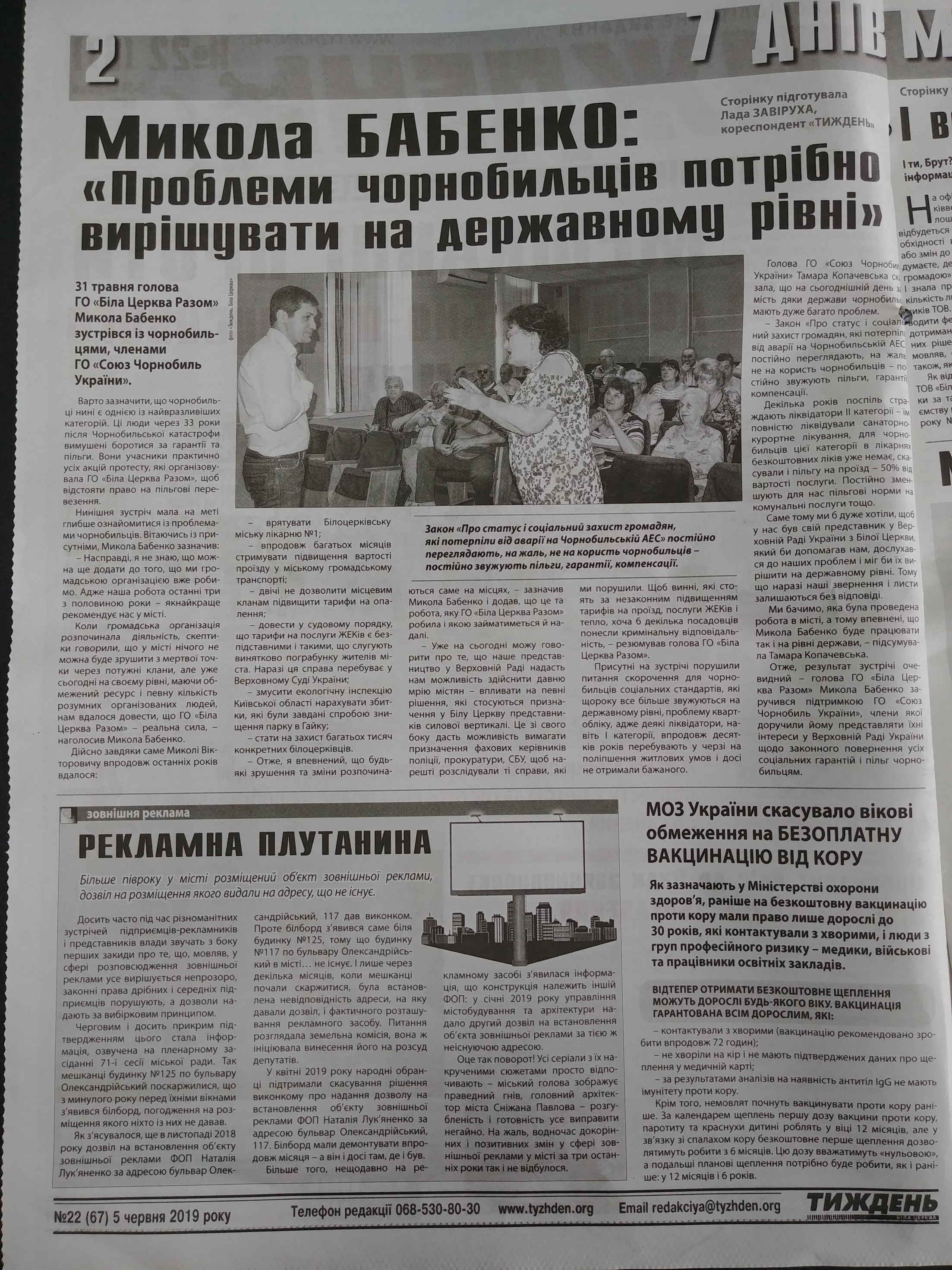Також у білоцерківській газеті «Тиждень» від та 5 червня та 29 травня є три статті про роботу ГО «Біла Церква Разом», яка веде активну діяльність протягом останніх двох років, та її засновника Миколи Бабенка особисто. Зазначимо, Микола Бабенко кандидувався до Верховної Ради у 2014 році в ОВО № 90 від «БПП «Солідарність», проте не пройшов. Вказані статті називаються «Микола Бабенко «Проблеми чорнобильців потрібно вирішувати на державному рівні», «Микола Бабенко «Біла Церква має пишатися своїми спортсменами» та «Микола Бабенко «Маніпулятори будуть притягнуті до кримінальної відповідальності».
