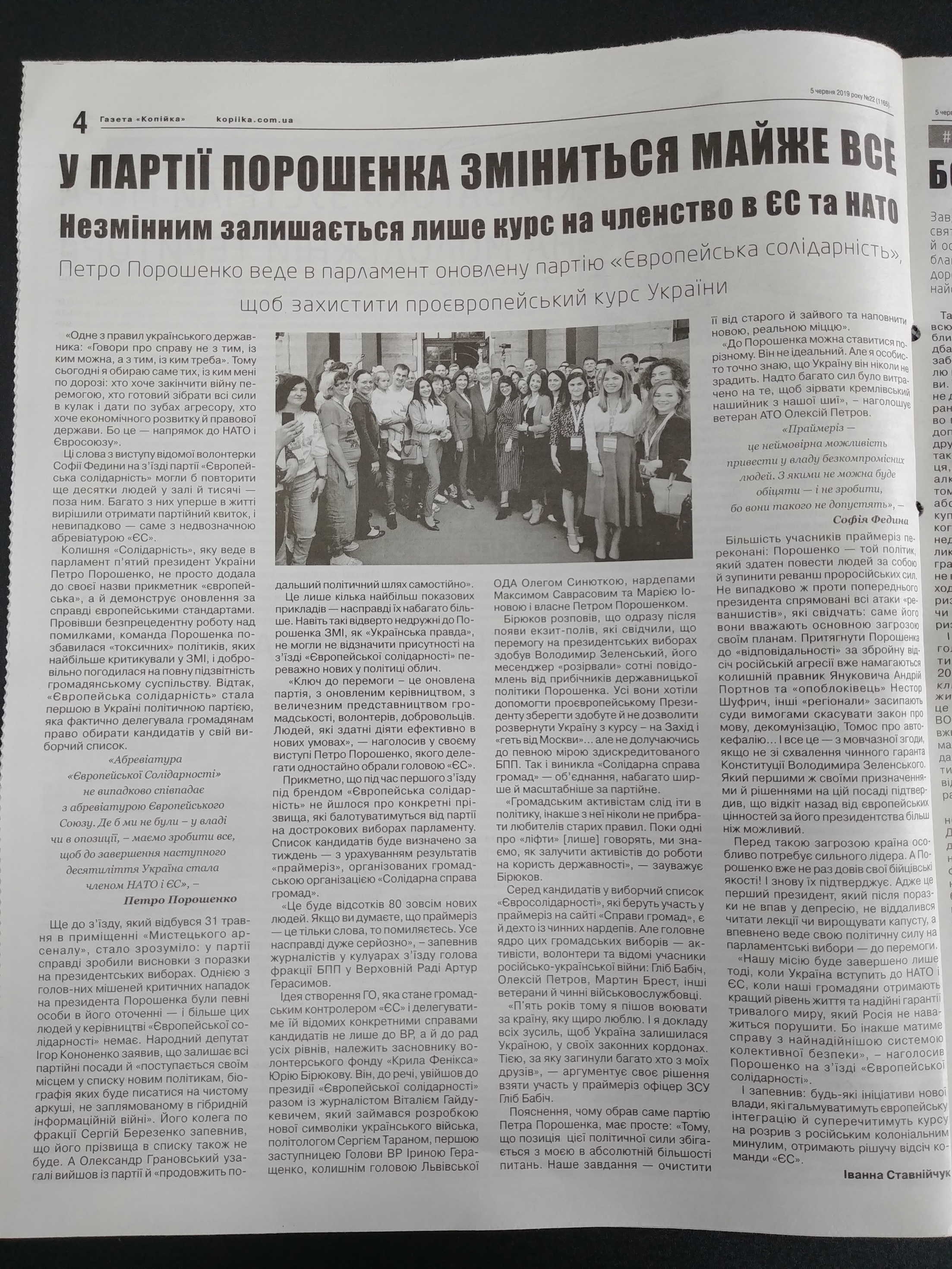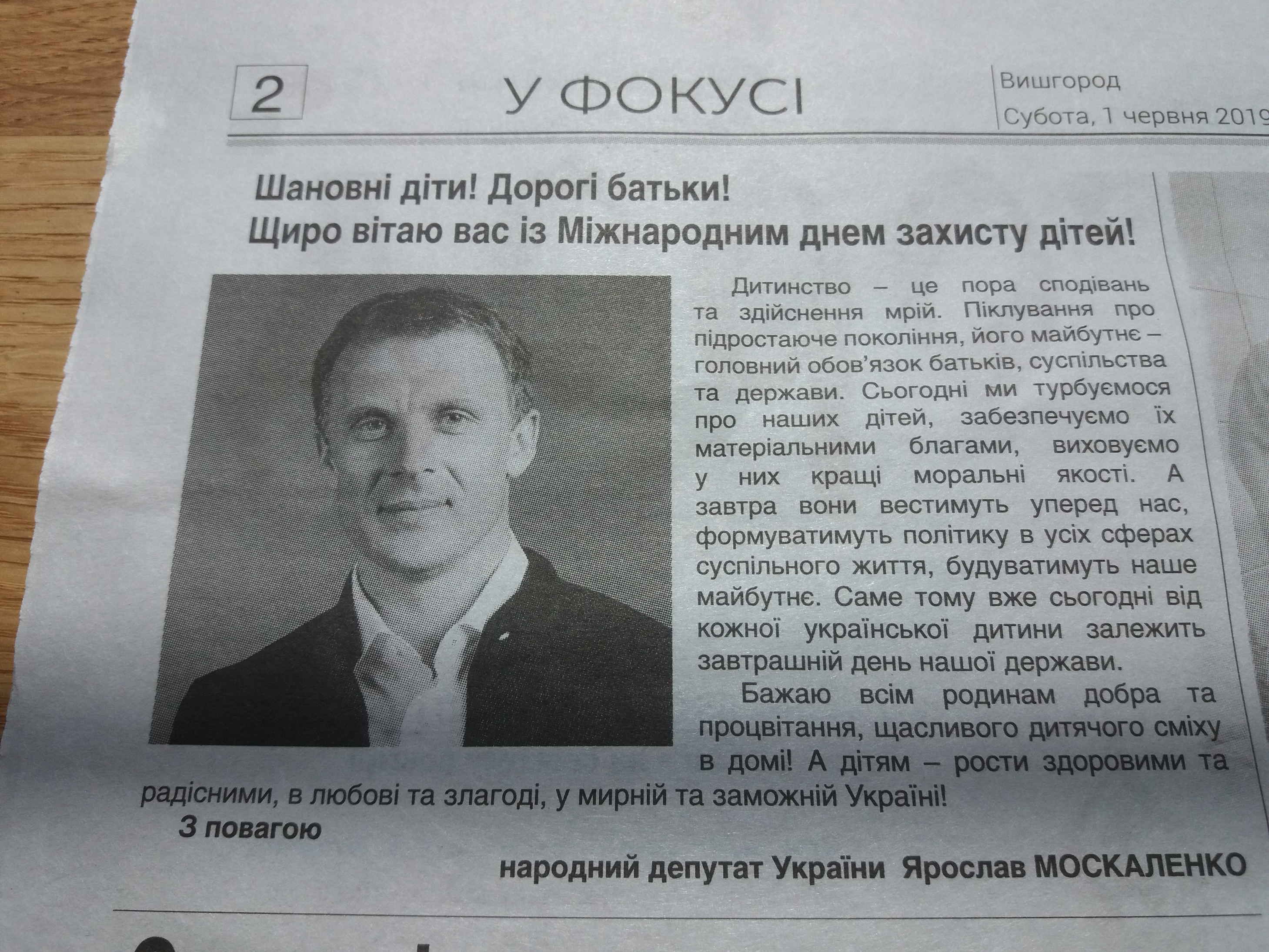 У друкованих засобах масової інформації найбільше матеріалів агітаційного характеру спостерігалось у 90 виборчому окрузі (місто Біла Церква). Однак в цьому окрузі наразі не зареєстровано жодного кандидата, тому опубліковані матеріали мають ознаки дочасної передвиборної агітації. У місцевій газеті «Копійка» від 5 червня є стаття про партію «Європейська Солідарність» Петра Порошенка. У заголовку йдеться «У партії Порошенка зміниться майже все. Незмінним залишається лише курс на членство в ЄС та НАТО. Петро Порошенко веде в парламент оновлену партію «Європейська солідарність», щоб захистити проєвропейський курс України. Стаття має ознаки агітаційного матеріалу. Крім того, у цій же газеті, міститися інформація про еко-пікнік, який відбувся на острові Дитинства в Білій Церкві. У ній вказується, що за сприяння депутата Верховної Ради від «Народного Фронту» Хвичі Мепарішвілі виділені кошти на очищення обвідного каналу та прибережних територій на острові. Зазначимо, що вищезгаданий депутат веде активну агітаційну діяльність у Білій Церкві.