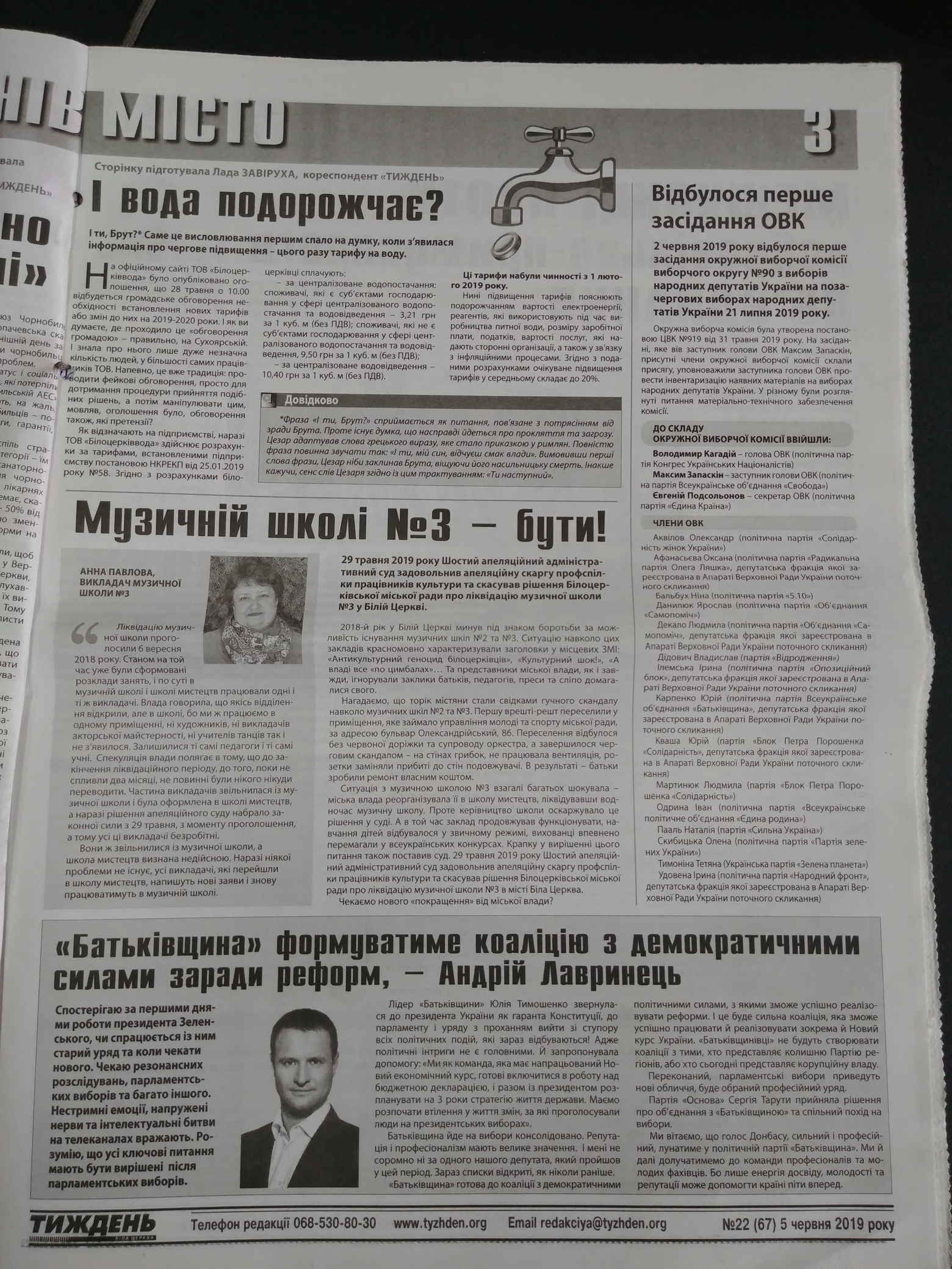 У Білоцерківській газеті «Тиждень» є дві статті з ознаками дочасної агітації щодо Андрія Лавринця. Зазначимо, він був довіреною особою Юлії Тимошенко під час виборів Президента 2019 та очолює міський осередок «Батьківщини». Одна стаття називається «Андрій Лавринець: є інноваційні ідеї – необхідна підтримка», інша – «Батьківщина» формуватиме коаліцію з демократичними силами заради реформ, – Андрій Лавринець».