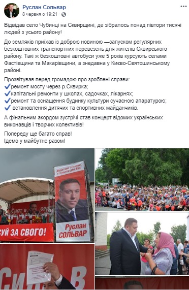 8 червня Руслан Сольвар відвідав село Чубинці на Сквирщині. Під час заходу повідомив про запуск регулярних безкоштовних транспортних перевезень для жителів Сквирського району. Такі ж безкоштовні автобуси уже 5 років курсують селами Фастівщини та Макарівщини, а знедавна у Києво-Святошинському районі. Про це йдеться у дописі на фейсбук-сторінці кандидата у народні. У цьому ж дописі йдеться і про те, що Руслан Сольвар під час заходу прозвітував перед громадою про зроблені справи: ремонт мосту через річку Сквирка, капітальні ремонти у школах, садочках, лікарнях, ремонт та оснащення будинку культури сучасною апаратурою та встановлення дитячих та спортивних майданчиків. Наприкінці зустрічі відбувся концерт за участі відомих українських виконавців і творчих колективів.