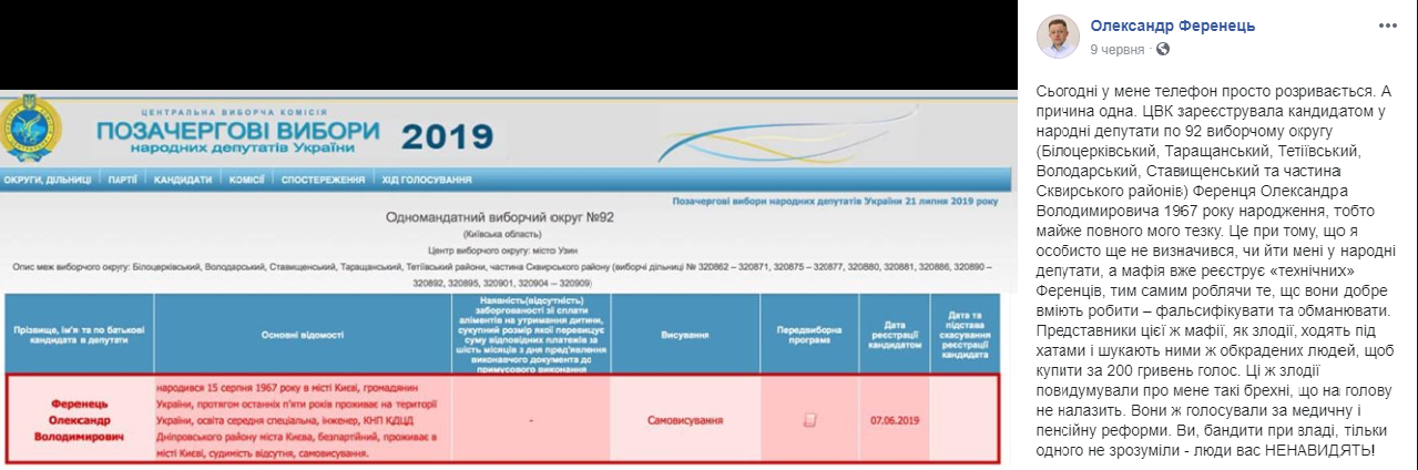 У 92 виборчому окрузі, який включає у себе місто Узин, Білоцерківський, Володарський, Ставищенський, Таращанський, Тетіївський райони та частину Сквирського району, помітну активність проявляє Олександр Ференець, а також Благодійний фонд Олександра Ференця «Фортеця». На FB-сторінці фонду йдеться про низку активностей, які здійснювалися від благодійного фонду, в тому числі і протягом червня. Зокрема, встановлено зупинку, попереджувальні манекени у селі Логвин на небезпечній ділянці дороги, придбано мікрохвильовку і планшет для амбулаторії у Ставищенському районі, а також солодощі та подарунки дітям на свята. Діяльність Благодійного фонду Олександра Ференця «Фортеця» активно висвітлюється на його сторінці у фейсбуці. Однак, сам Олександр Ференець наразі не є зареєстрованим кандидатом у народні депутати ні в 91, ні в будь-якому іншому виборчому окрузі і висловлює своє обурення щодо реєстрації кандидата у депутати Верховної Ради з таким самим прізвищем та ім'ям – Ференець Олександр Володимирович. Його ЦВК зареєструвала 7 червня. У своєму дописі щодо цієї ситуації Ференець зазначив, що особисто ще не визначився, чи йти йому у народні депутати.