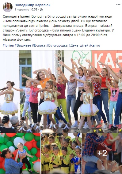 1 червня в День захисту дітей в у низці населених пунктів округу, зокрема, у Боярці, , Ірпені, Білогородці та Михайлівці-Рубежівці були проведені свята за підтримки Володимира Карплюка. Цей захід висвітлювався в тому числі й на сайті місцевої ради в матеріалі який може містити ознаки агітаційного