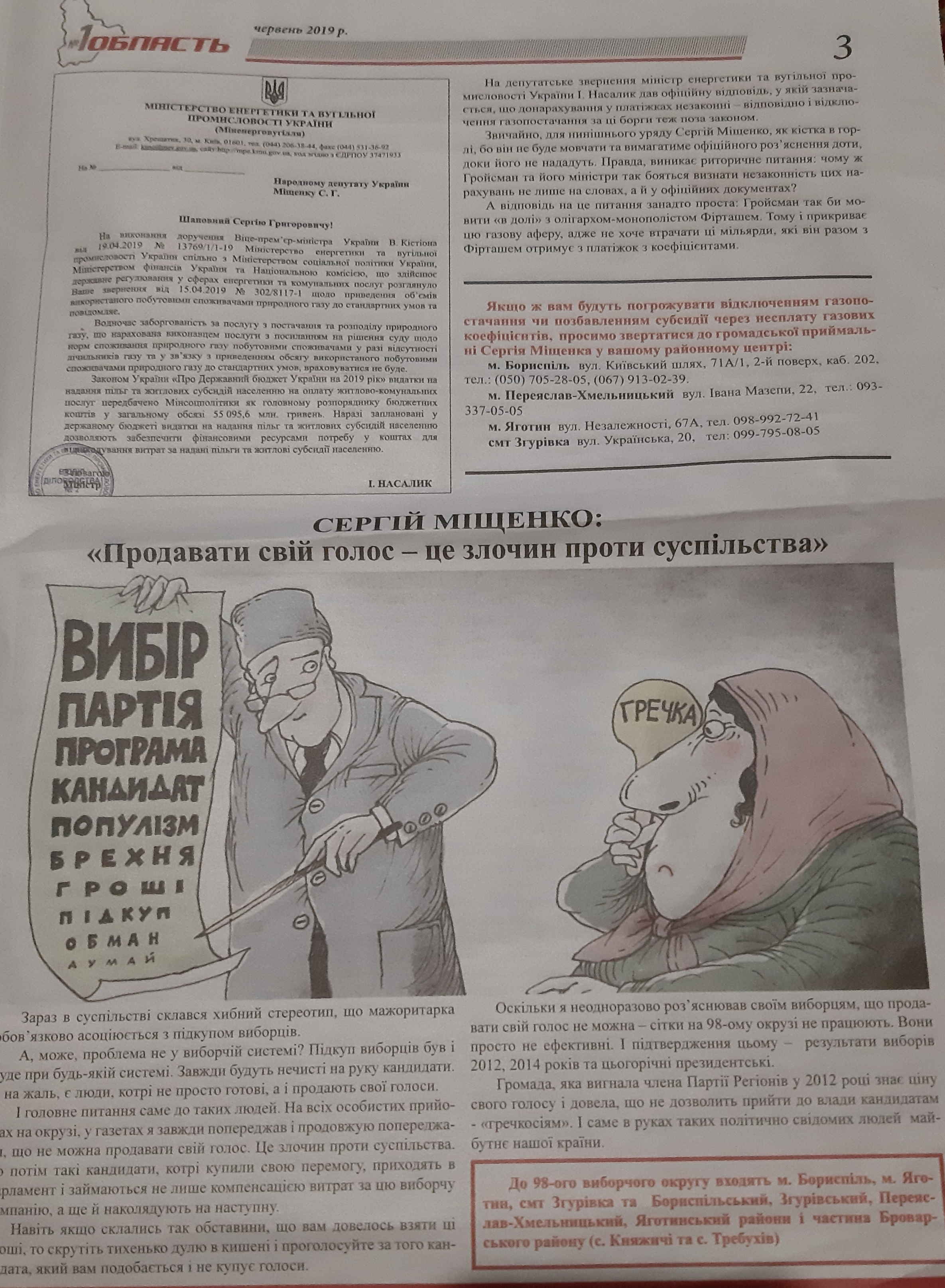 Низьку активність спостерігачі ОПОРИ фіксують і у 98 виборчому окрузі. Він включає в себе Яготин, Бориспіль, а також Бориспільський, Згурівський, Переяслав-Хмельницький, Яготинський райони та частину Броварського району. Станом на 12 червня в окрузі зареєстрований один кандидат у народні депутати Сергій Міщенко, самовисуванець, його зареєстрували 7 червня. Він також є чинним депутатом Верховної Ради у цьому окрузі. Щодо зафіксованої активності – в Яготині 5 червня мешканцям міста вкидали в поштові скриньки інформаційний бюлетень «#1 область» (номер за червень). Видання розповідало про Сергія Міщенка, чинного народного депутата. Зокрема, йшлося про роботу Сергія Міщенка в пенсійній реформі, про те, що він є автором законопроекту про підвищення штрафів за порушення на ринку природного газу. Також опублікована стаття «Сергій Міщенко: Продавати свій голос – це злочин проти суспільства». Однак, невідомо, хто розповсюджував даний матеріал, видання взагалі не містило жодних вихідних даних. Між тим, були вказані адреси та контактні телефони громадських приймалень Сергія Міщенка у Борисполі, Переяслав-Хмельницькому, Яготині та Згурівці. Інших випадків агітації в окрузі наразі не зафіксовано.