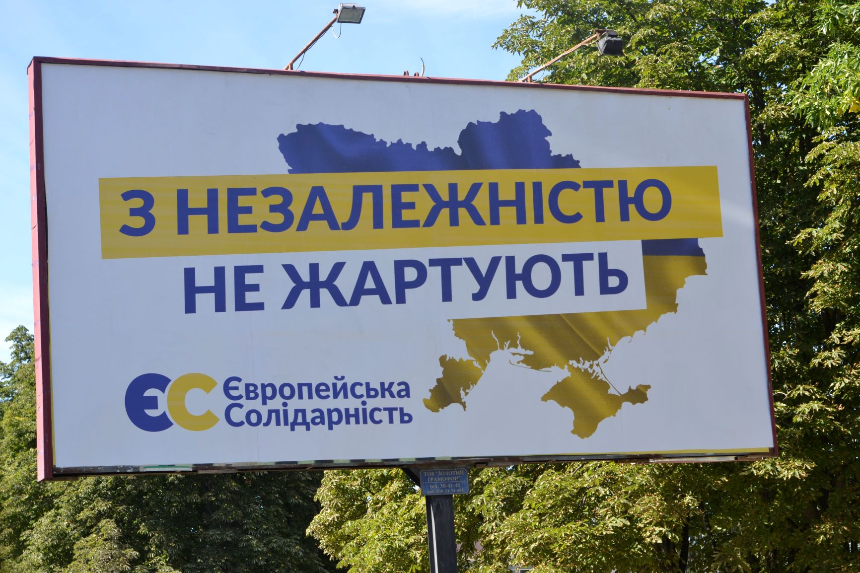 «Європейська Солідарність» на білих білбордах використала карту України у жовтно-блакитних кольорах та написи «З НЕЗАЛЕЖНІСТЮ НЕ ЖАРТУЮТЬ. Європейська Солідарність».