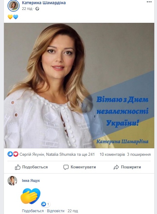Депутати міськради також на своїх сторінках опублікували привітання: Олександр Шамардін та Катерина Шамардіна («Рідне місто»), Сергій Капітонов (ВО «Свобода»), Валентина Яремчук («Європейська Солідарність») та інші.