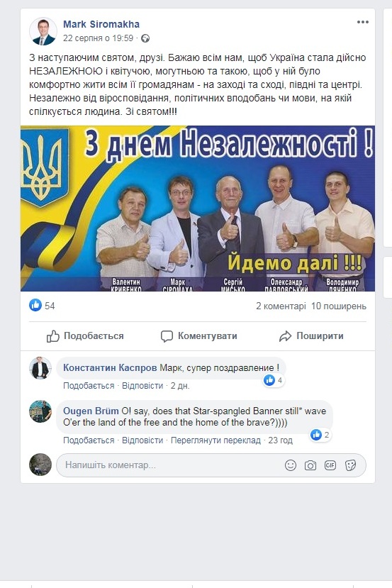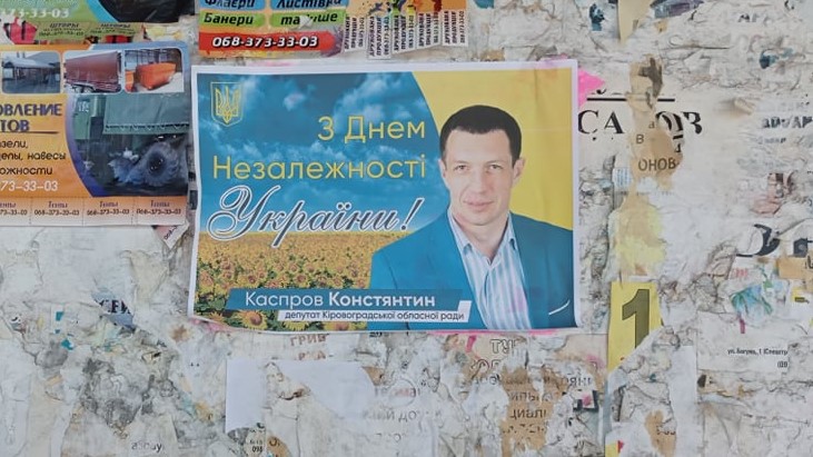 На зупинках громадського транспорту розвішали привітання від депутата Кіровоградської обласної ради («Опозиційний блок – За життя») Костянтин Каспрова. На фоні соняшникового поля розмістили фото політика та напис «З Днем Незалежності України. Костянтин Каспров». У рекламі також використовують зображення прапора та тризуба.