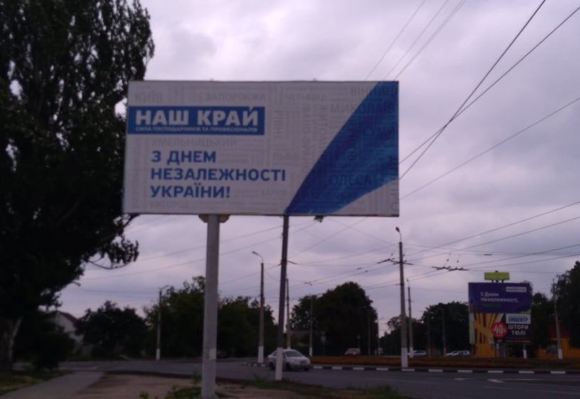 Партійний осередок «Нашого краю» використав для привітання синьо-білі кольори, а також написи міст України. На білборді традиційно вітали мешканців обласного центру «З ДНЕМ НЕЗАЛЕЖНОСТІ УКРАЇНИ. НАШ КРАЙ».