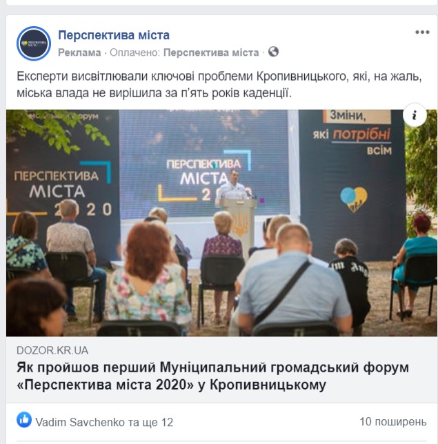 Відійти від звичних свят вирішив політик Артем Стрижаков і на день Незалежності України на набережній Інгулу провели перший муніципальний громадський форум «Перспектива міста 2020». Як йдеться на сторінці партії «Перспектива міста», експерти висвітлювали проблеми обласного центру. У соцмережах запустили рекламу публікації про проведення форуму, оплатили рекламу від імені політичної сили «Перспектива міста».